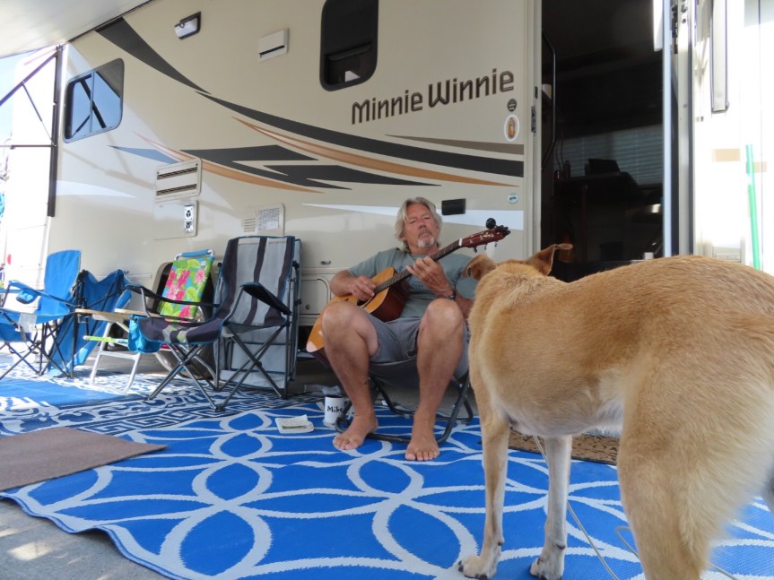 Nothing unusual going on these past few days. The wind has been blowing strongly from the north making stand up paddling unappealing (bumpy water and notable current) so I’ve been relegated to boogie boarding or swimming in the pool. Spending plenty of time with my toes in the sand. I’ve been out to a couple of meetings and a grocery shop but otherwise hang close to home. Lots of quality time with the pooch and I’ve finally got most of the picking down for East Bound and Down. Now it’s just a matter of working on the timing.