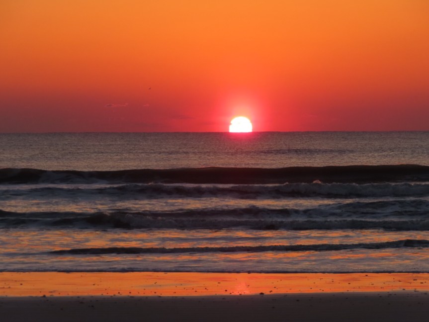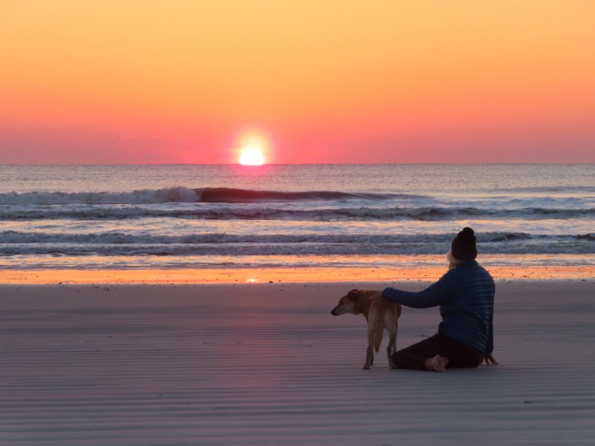 Another dawn breaking over the Atlantic. This morning PJ joined me and Cali for a sunrise stroll along the sand. A peaceful, colorful start to a sunny Florida day. There were some decent waves leftover from the stormy days earlier in the week and the wind had turned to a hard offshore breeze. I put on my new wetsuit top and paddled out for the best surf I’ve had since getting my new hip. Towards the end of the session, the wind began blowing even harder leaving big raining drops of spray off of each wave. The wetsuit wasn’t quite warm enough so I called it a session after just over an hour. I went back to the RV and collected PJ and Cali and we all went down to the beach to hang out.