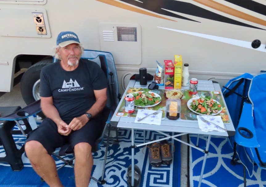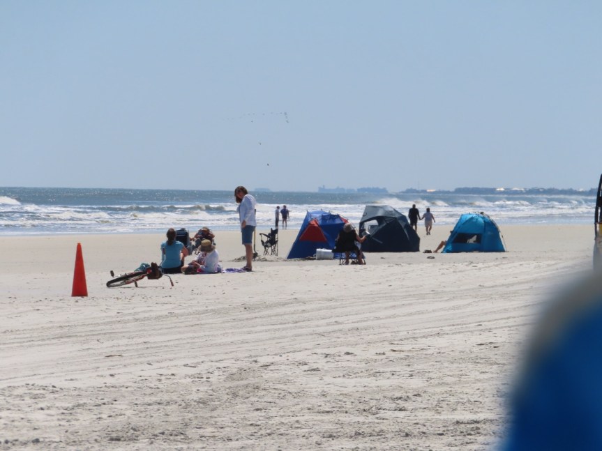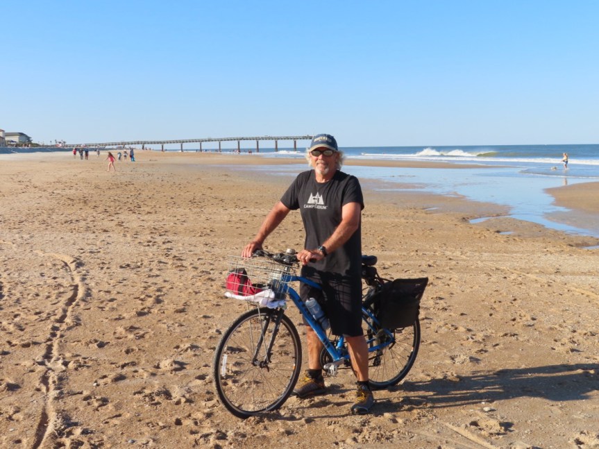 In the afternoon, we watched another online lecture from a spiritual teacher and did a meditation session. We did a little napping and hanging around on the porch. As evening approached, we hopped on our bikes and did an hour long trek down the beach. There was a super low tide providing a wide expanse of beach to ride on. We needed every inch of it to dodge the crowds of people out taking advantage of the mild spring conditions.We went towards the pier but as we drew near, the sand began to get soft, so we turned around and pumped it hard back past our camp for another mile or so then we turned around and came back. An awesome ride to finish off the day.