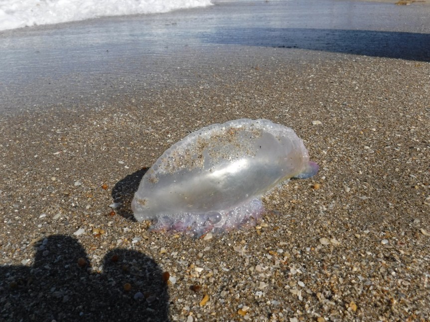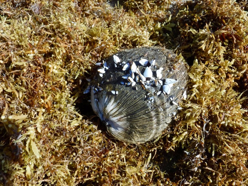 On the way back to Hutchinson Island, we grabbed a veggie delite sandwich at Subway and took it over to the beach in front of Holiday Out and sat on the sand and refueled. There were a handful of oldies from the community lounging on the beach dodging the high tide and the abundance of sargasso weed that was washing up on the shore. We jumped in for a swim but the seaweed was thick we didn’t stay in too long. We took a stroll up the beach to check things out but didn’t see much other than a man o’ war and a washed up coconut with a bunch of shellfish growing on it.