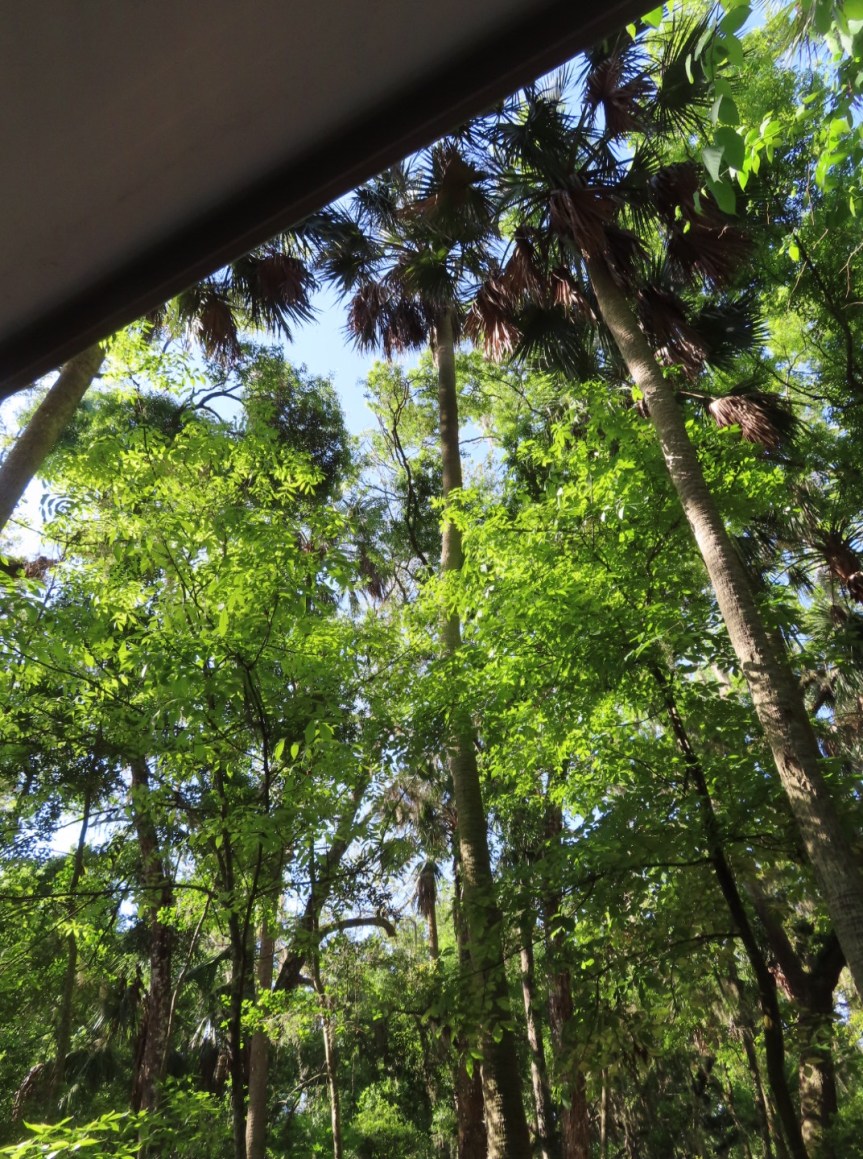 Being such an undisturbed growth of old oak and palmetto forest, they call them hammocks here in Florida, things can get a little sketchy when the weather takes a turn for the worse. Back in December, a number of cars and RVs got damaged by falling branches when a storm came through so when yesterday’s forecast for severe thunderstorms and high winds arrived about half of the park fled like cockroaches when the lights come on. Me, I’ve got nowhere else to go. The rest of us hunkered down and sat it out. Some more cavalier campers were bar-b-quing under their flapping awning with no shirts on. Go Gators!