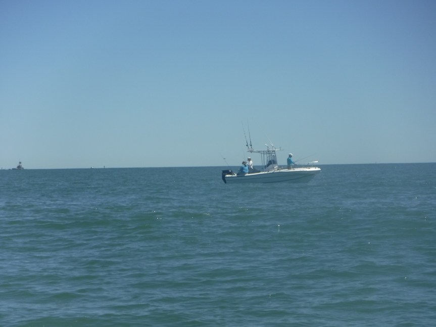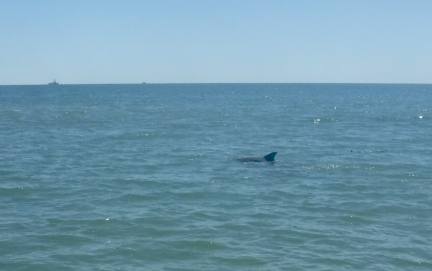 As I was suiting up a large pod of dolphins were passing by a ways off shore. I jumped on the board and paddled out to them. There were nine dolphins in the group and they were leisurely moseying to the north. By the time I came abreast of them, we were 3/4 of a mile out. They maintained a distance of about 50 feet never letting me get too close. I escorted them down to the poles then turned around before entering the navy base at Mayport. Some fishermen were anchored in front of Dolphin Plaza fishing from their boat. They seemed surprised to see me passing by and giving them a wave. I paddled back to my starting point and rested in my shaded chair sipping a Monster and eating a Clif bar. I spent the next few hours either relaxing in the shade or wandering around hunting for teeth and sea glass.