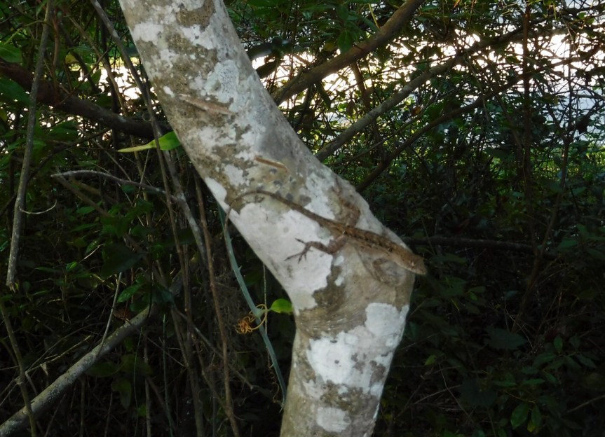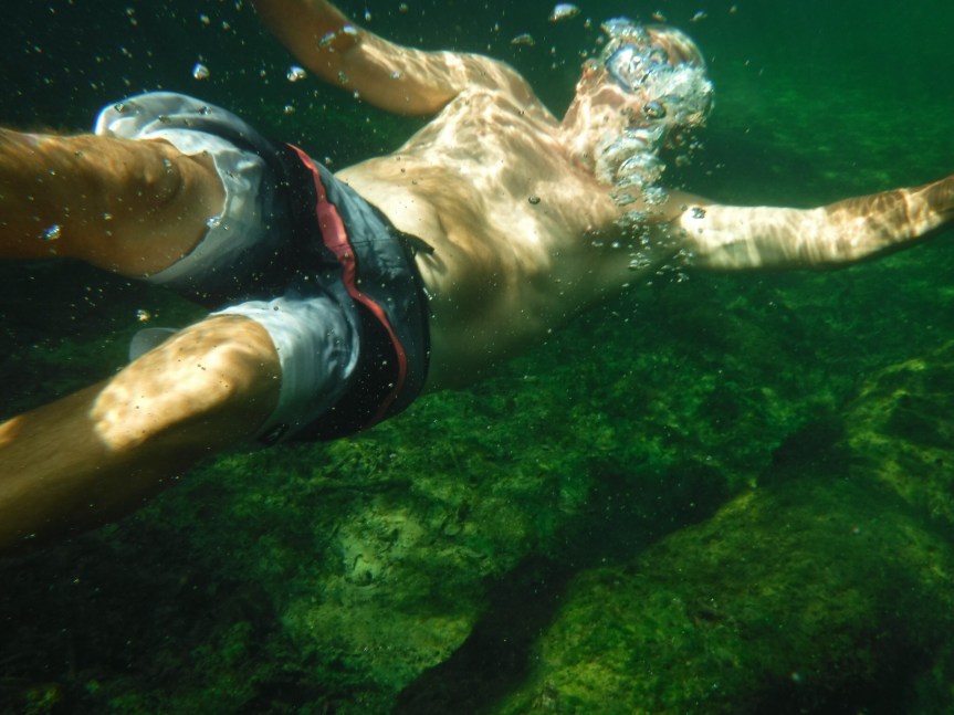 After relaxing in the shade on the porch for a while, our curiosity got the best of us and we unchained the bikes and made our way over to the spring. There was a long aluminum platform for getting into the water. It was fresh water and crystal clear. The signs claim that it maintains a fairly constant temperature of 72 degrees year round. That’s why the manatees make it their overwinter hang out when the ocean gets too cold. Unfortunately for us, the sea cows had all moved along over a month ago. On the plus side, when they are not here you are allowed to go swimming in the spring.