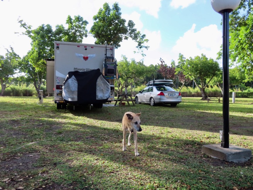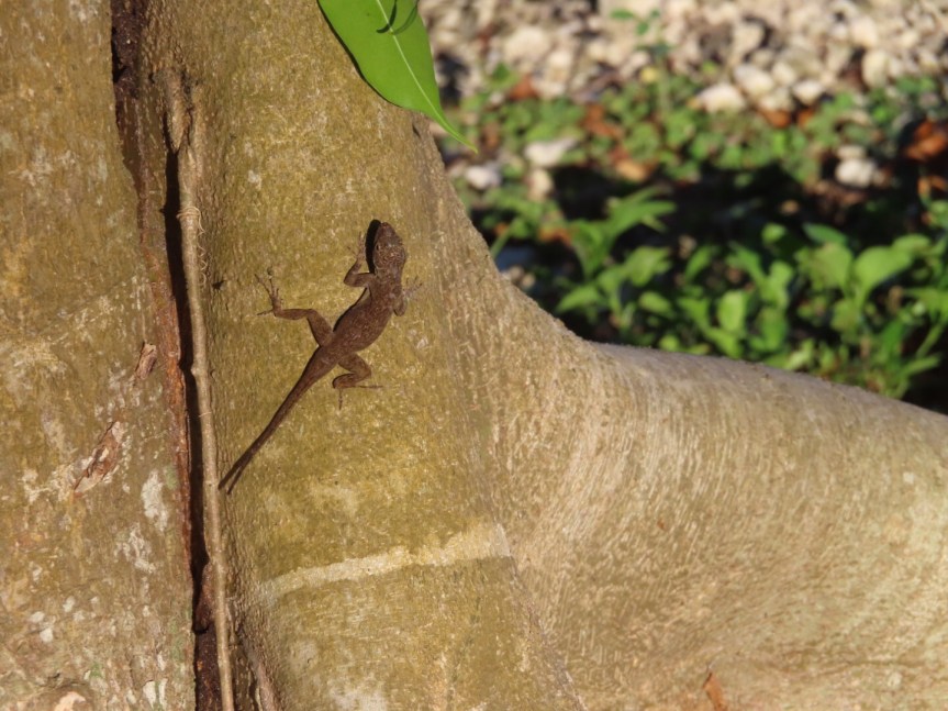 There were a lot of campers crowded into the full hook up sites, but the camping area lacking sewer service in a grove of trees only had one person camping. We switched our arranged site over to one of those and set ourselves up in a nice quiet spot beneath the trees. It had rained off and on throughout most of the drive but it really came down hard just as we were setting up. We waited it out then took Cali on a tour of the grounds which has a trail through the trees that circles the entire park. Surrounding the park are nurseries and agricultural fields growing palms, sugar cane, bamboo, bananas and lots of other fruit trees I wasn’t sure of. Definitely getting tropical. A mango tree had some freshly fallen mangoes on the ground so we picked out the best few and took them back to the RV to see if we can get them to ripen up.