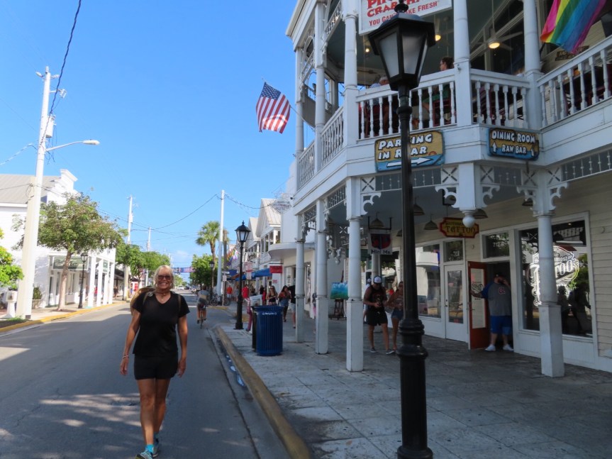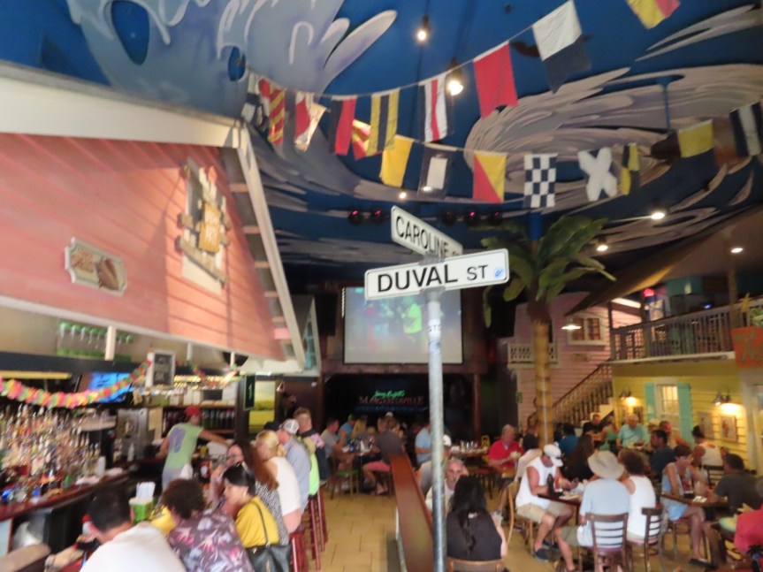 We had spotted an unoccupied table at the open air front window looking out on Duval, so we claimed it and relaxed for a tasty dinner served up by an amiable young man named Pablo who was also training a new waitress to be a server. It turns out the new waitress is his mother. He explained to us on the side that it was hard training his mom because when she goofed up he was uncomfortable telling her what she did wrong. They were charming and we had a great meal with parrothead music in the background, a lively crowd partying at the bar, and a street level view of all the animated people walking by our seats.