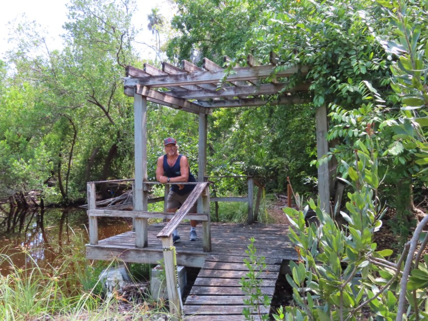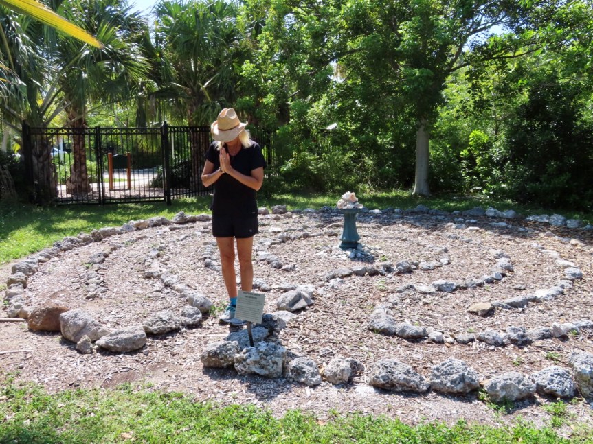 PJ had some phone calls to make and I had a nap to take, so we headed back to Boyd’s and did some lounging for the hottest part of the day. In the afternoon, there was no rest for the wicked as Pea still had several agenda items on her list that needed to be checked off. We got motivated around 4:00 and paid a visit to the botanical gardens over near the community college. We meandered through the grounds always looking for the shadiest spots to keep from sweltering in the torrid heat. Even the butterflies were taking a siesta as we only saw a few living creatures as we roamed the property. PJ found a labyrinth and did a meditative walk around the concentric circles while I admired some Cuban palms and a wall of interesting epiphytes. The air conditioning had stalled in the docent’s office and she wasn’t about to remain on the grounds a minute after the bell chimed so we got the heave ho and took the drive into the city center.