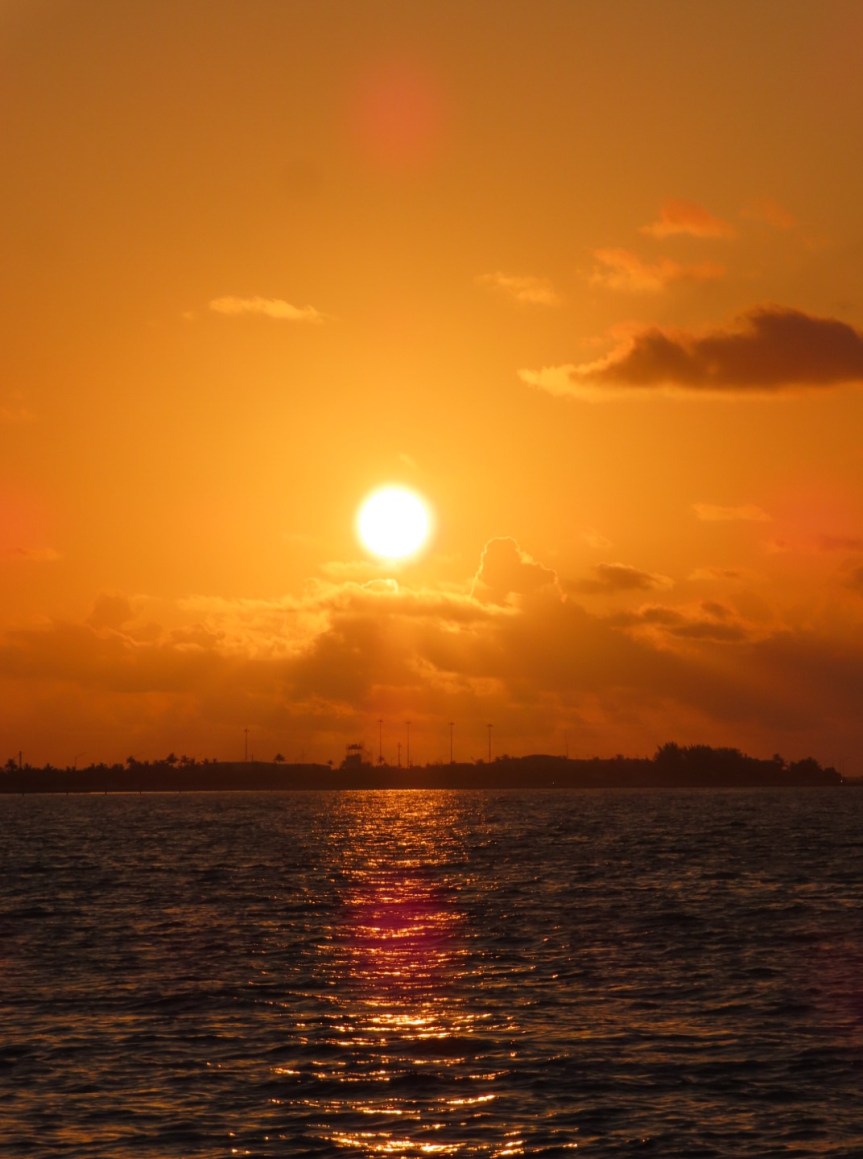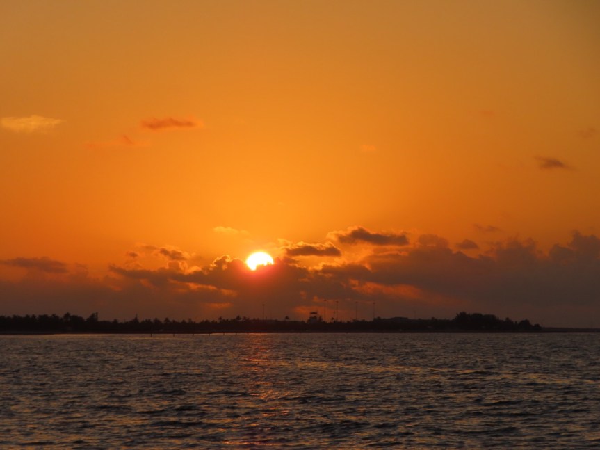 The sun made a spectacular entrance and all eyes were over the railing looking east as the golden orb moved up into the morning sky. Salty locals, young lovers, tourists on skates and sunburnt RVers with a senior dog all stopped for a few moments to gaze in awe at the glorious display and to contemplate the possibilities that are open to them as we move into the fresh beginning of a new day.