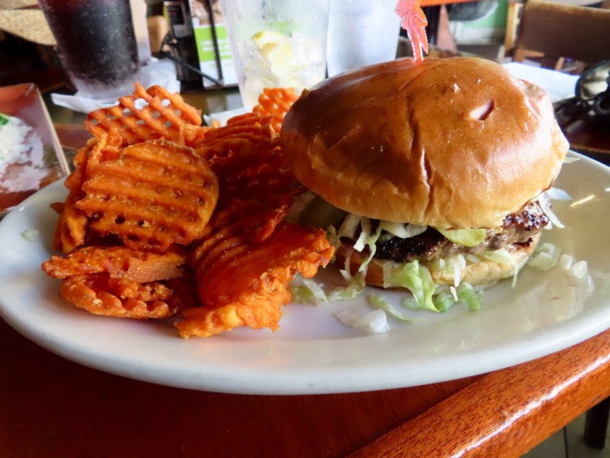 We moved over to Duval Street, the main tourist artery lined with bars, eateries, cigar stores and souvenir shops. We joined the diverse and colorful array of tourists slowly moseying along both sides of the avenue. We perused a few stores and steadily ticked off the blocks until we found ourselves in front of Jimmy Buffett’s original Margaritaville restaurant. PJ had wanted to see the famous landmark and I decided to do her one better and actually sit down for a cheeseburger in paradise.