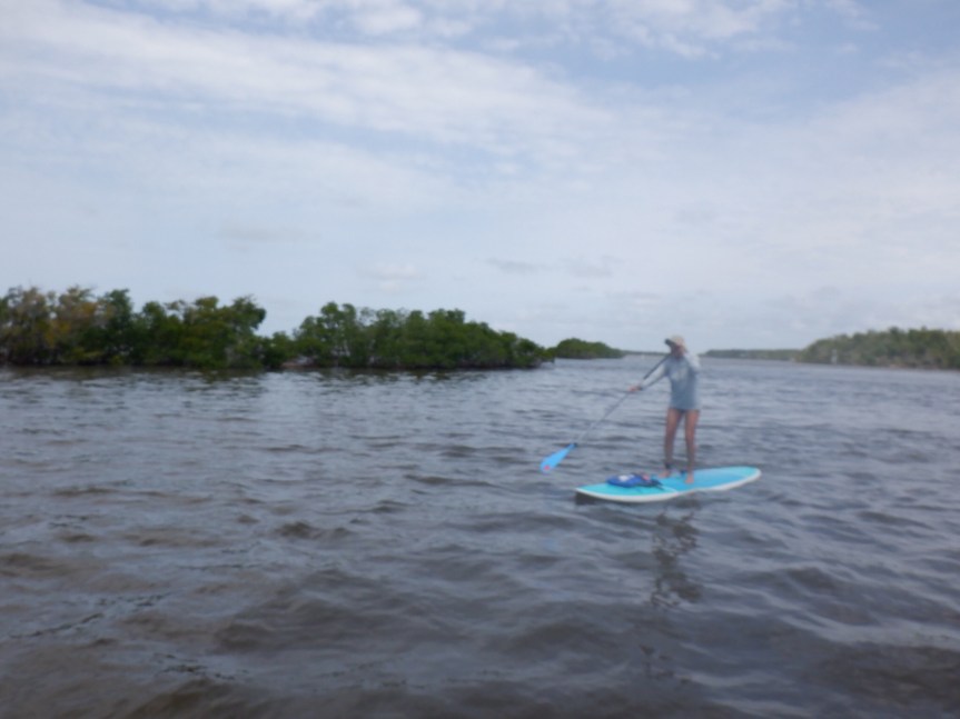 Our deck area is so inviting that we had a hard time getting motivated to do anything but lounge in the shade of the large tree that sits in the center of the yard. We decided to paddle across the bay and explore a ways up the Turner River. I thought I had the tide dialed in to help us on the way out then switch halfway through and assist coming back in. It might have worked out that way but when we got to the mouth of the river the wind was blowing hard and the current was sucking us in hard. We were worried that we might not be able to fight the current if we went too far in so we decided to turn back and follow the channel that runs up the road side of the bay into Halfway Creek. It was hard going fighting the elements to get back out into the bay. We sprinted from mangrove islet to mangrove islet to hide on the leeward side and finally got back along the mangroves lining the bay and worked our way into Halfway Creek.