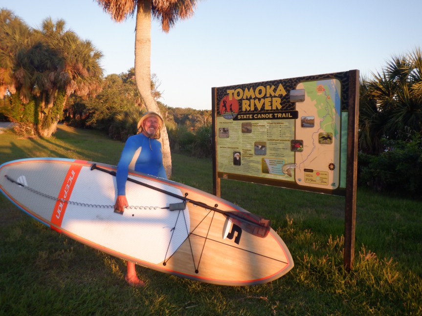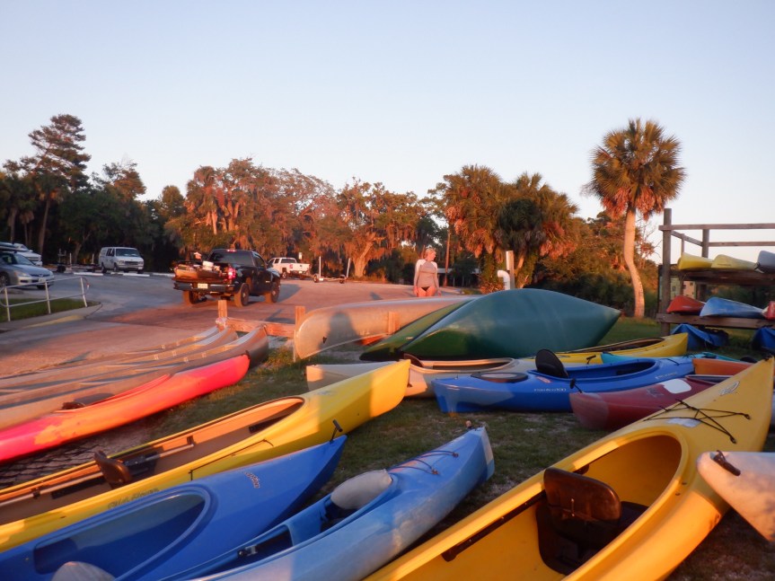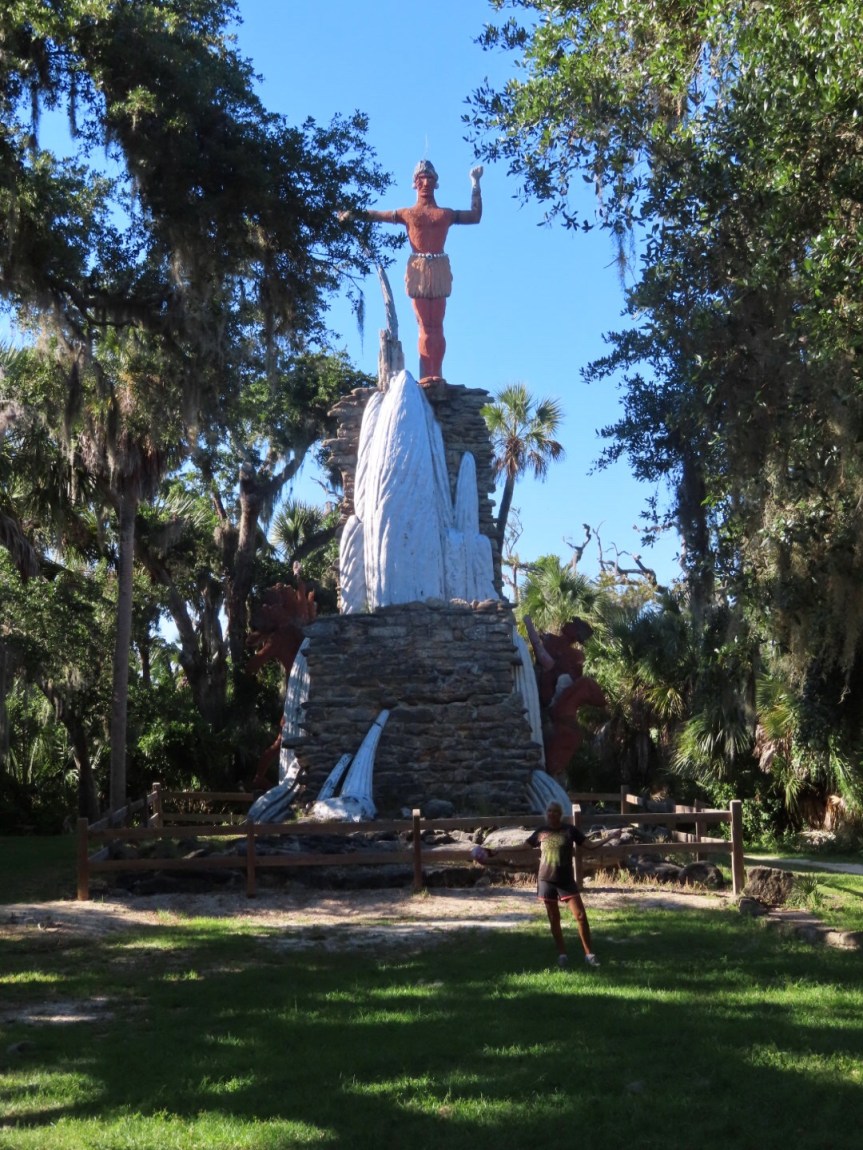 We set up camp then took off on the bicycles to see what goes on in Tomoka State Park. We rode down to the marina and had a look at the Tomoka River. We pedaled to the end of the road and had a peek at the big statue honoring ‘Tomokie’ a Native American chief from the 1600s. There were a few narrow side roads we explored looking at other places to paddle.