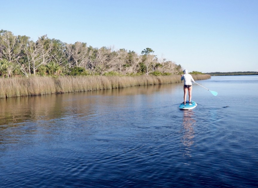The marina seemed like the best place to start an adventure so we launched the boards from their little dock and paddled down the river towards the Ormand Beach coast. Beautiful palm and pine forest lines the banks. The bridge where the road in crosses is a popular spot for locals to fish. A group were sitting on the concrete foundations while others cast their lines from the bridge above. We passed under and kept following the channel markers around the next big bend.
