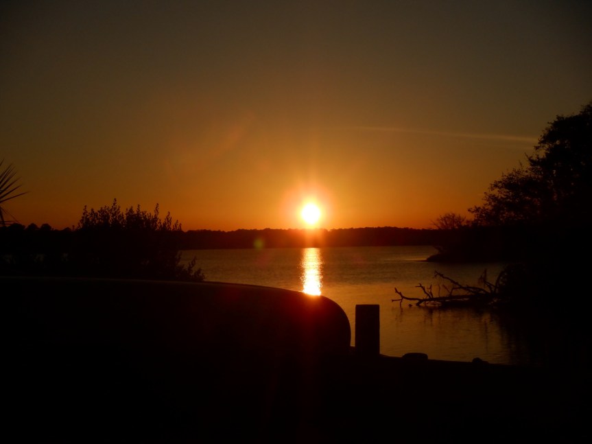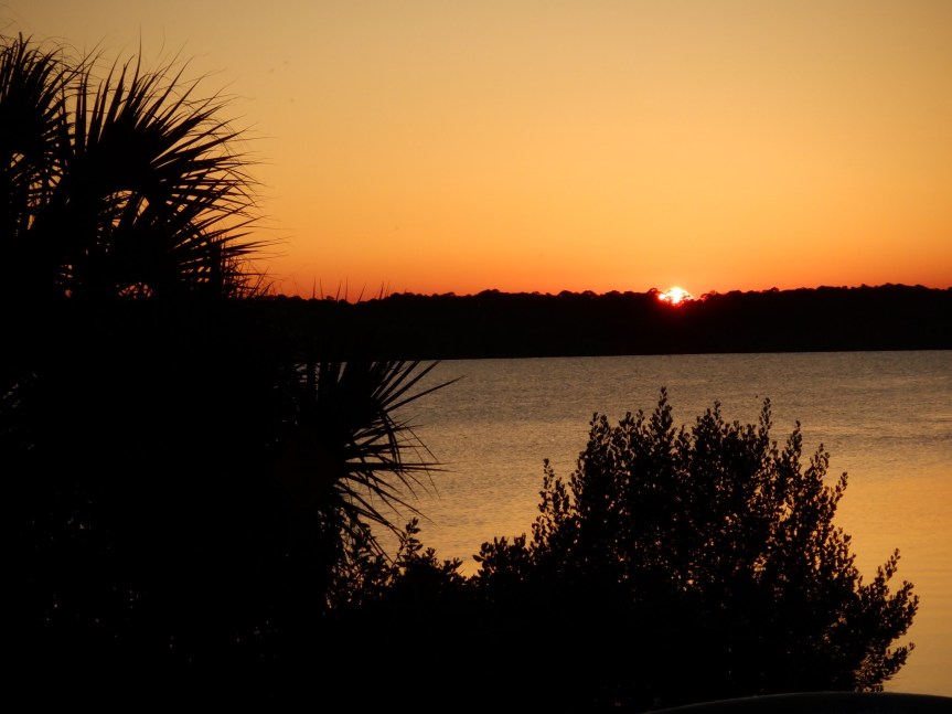 A cross Florida travel day today, west coast to east coast. Fort DeSoto has an early check out at 11:00 and the anxious camp hosts were stalking us beforehand. They must have some Saturday plans they are eager to get on with. At 11:03, as I was putting the final item we had out away in the basement, they rolled up in their little golf cart and asked if we were leaving. I said yes and they scoldingly said check out is 11:00. We laughed as we pulled over to the dump station to do our thing. Rebels, with three infractions by eleven o’clock – three minutes late, I drove the wrong way on the one way road over to the dump station (we were the 2nd site in and rather than do the whole park loop, I slid out the 100 feet) and Cali walked over without her tether. We were soon on the road for a grinding drive through the center of Florida. Traffic was thick through the Orlando – Kissimmee corridor with a few accidents and just a lot of people. Who lives here? If one was to live in Florida there are two beautiful coasts, who would choose to live in the hot, swampy, flat ass middle of the state? Tons of Disney employees, I guess. I stopped at the Marathon station in Kissimmee to clean the coating of splattered bugs off of the windshield. After I started pumping, I realized the squeegees were all missing. When I asked the clerk inside, he said the locals steal them all, so he gave up. So I’m still peering through a layer of “love bugs” as I drive into Tomoka State Park in the late afternoon.