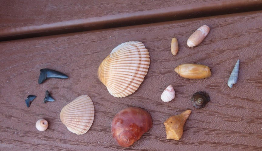 In the heat of the day, we ventured out for another walk down the beach. I went first then PJ came along after an afternoon nap. We scouted for teeth and waded in the brackish water. The fishermen today were having a bit of luck hauling in a couple of flounders to filet up for dinner. PJ found the mother of all shark teeth, well at least the biggest one that either of us has found. It was like finding gold in them thar hills!
