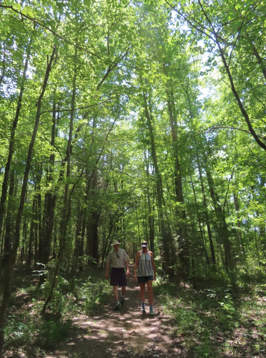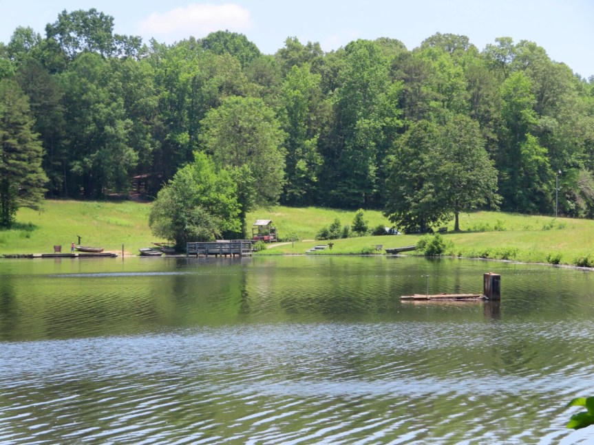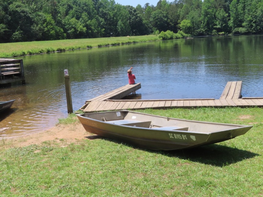 Our friend Tom came by mid morning to visit also. Tom and PJ were roommates back in the wild eighties in a house in Cardiff they dubbed the Ponderosa. He and his family moved out to the Carolinas about ten years ago and have settled in a beautiful spot right over the North Carolina border. We last saw them back in October of 2016 when we passed through on a long convoluted route to Mexico. Tom joined in the conversation and got some coffee into his system to stimulate him to go for a walk with Cali and me. We left the ladies to chat about things they might not want to elaborate on in front of us guys and strolled over near the canoe launch to see what was going on. Not too many people out and about as the day was starting to heat up with that famous southern humidity. A pair of camouflaged fishermen in kayaks were seriously casting away along the shore. I can’t picture there being fish in this small lake serious enough to get that geared up, but good luck boys. I tried to talk Tom into going for a paddle on the boards but he wasn’t having it. We poked around along the grassy shore for a few minutes then retreated back into the leafy shade of the trees.