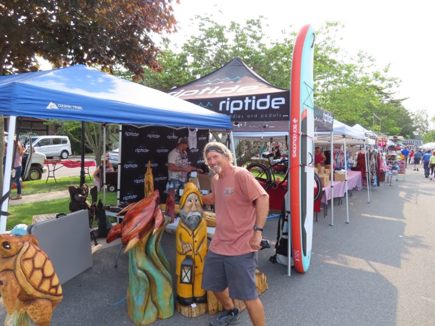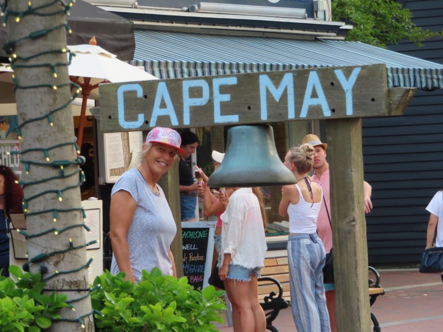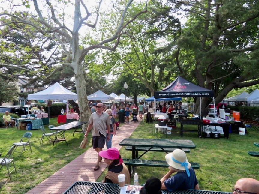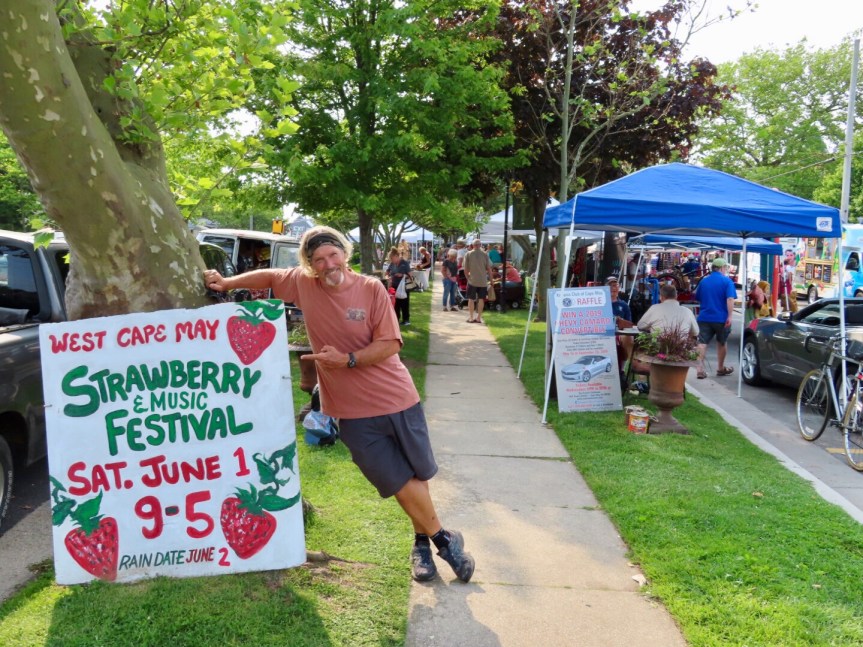Today we rode our bikes over to Wilbraham Park for the annual Cape May Strawberry Festival. The event has two long aisles of booths, one down the paved street and the other on the grass inside the park, where vendors of all types were hawking their wares. Jewelry, antiques, tie dye clothing, wood carvings, you name it they had it. Not to forget the food, strawberries were the star along with lots of other freshly prepared offerings. A band of geriatric rockers was going psychedelic in the center of the lawn. We spent some time wandering among the colorful displays managing to not buy a single unneeded chotzke to add to the already crowded RV. We found an unmanned bench on the grass and sat down to people watch before unlocking the bikes and riding down to the beach boardwalk.