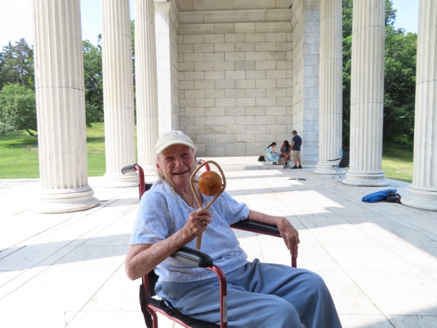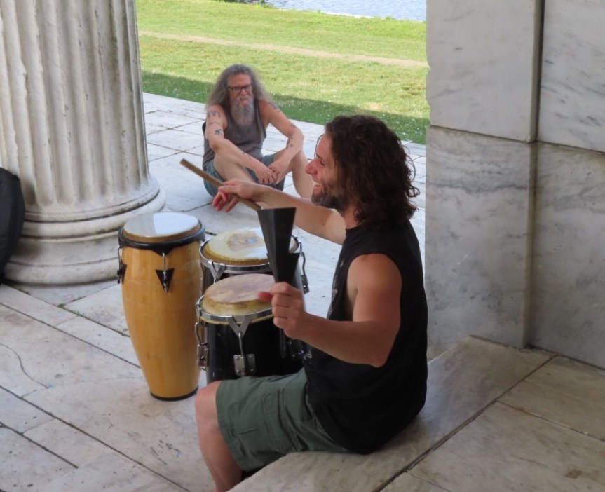 Occasionally a friend will stop by and we can strum a duet and give her some different variations to listen to. My friend Harlan came by and we mixed up some Pink Floyd and Arlo Guthrie that she seemed to like. In mid July, some of his bro’s were setting up a drum circle down at the Temple of Music so we rolled Carole across the lawn and she had an amazing time wielding her Native American shaker and grooving to the beat. She was a celebrity with all of the crew and she had a special affinity for our friend Josh, she was watching his drumming and kept commenting on his long hair. She’s good for maybe two hours on an outing so we do our best to keep it under that. She had a great day and couldn’t stop talking about it until it slipped from her files the next day. Any time there’s a tune in the air she finds a special peace and that’s just a testimony to the power of music. May the beat go on.
