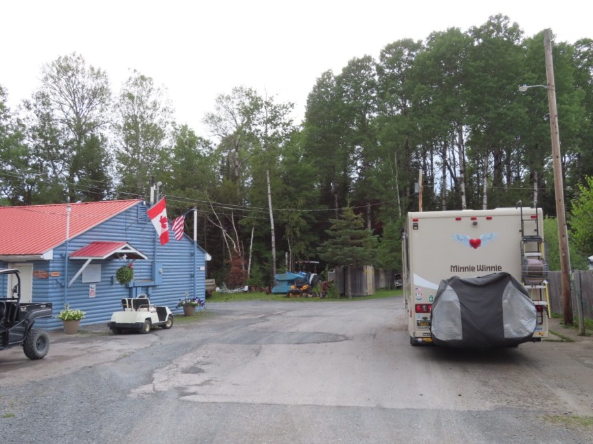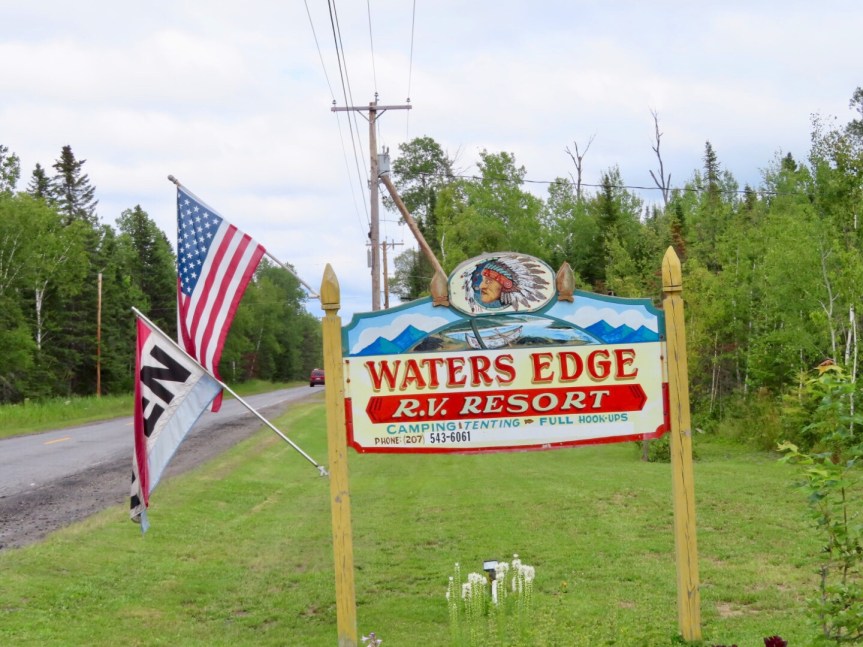 The weather took a slight turn for the worse so we took our time getting the day started. We were moving the RV over to the lawn on the other side of the house to clear the beach area to get it prepped for Martha’s birthday party on Sunday. PJ and I drove the motorhome over to the RV park her Uncle Graydon owns and we used their facilities to dump our waste tanks. It’s on a nice stretch of Mud Lake with a large dock and lots of toys for the visitors. The managers were cool and we had a look around and checked out the campground. It’s up for sale if you want to have your own piece of lakefront paradise in the northernmost corner of Maine.