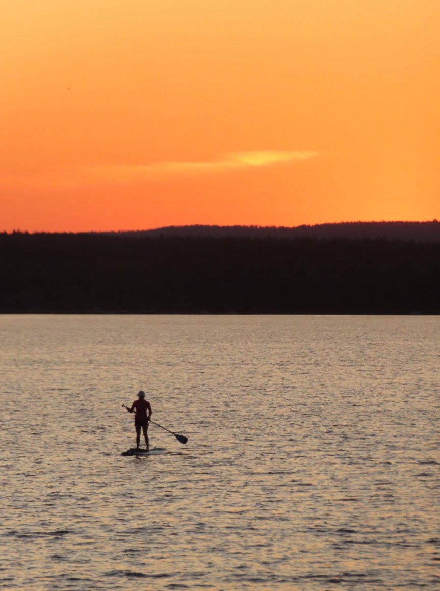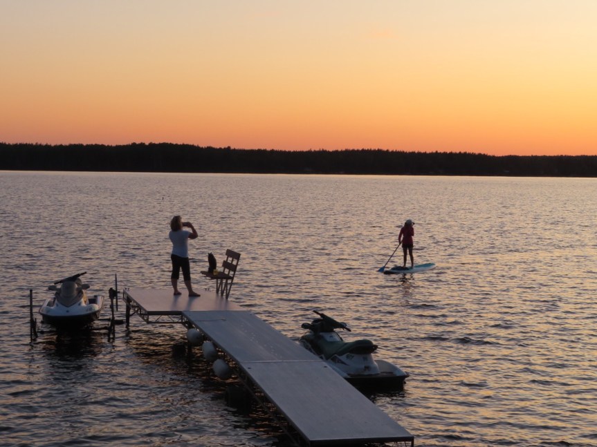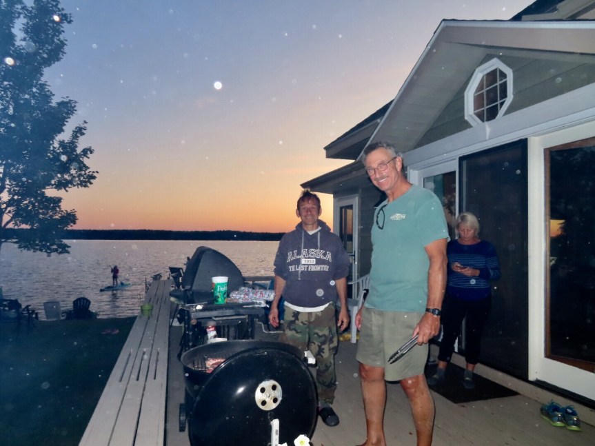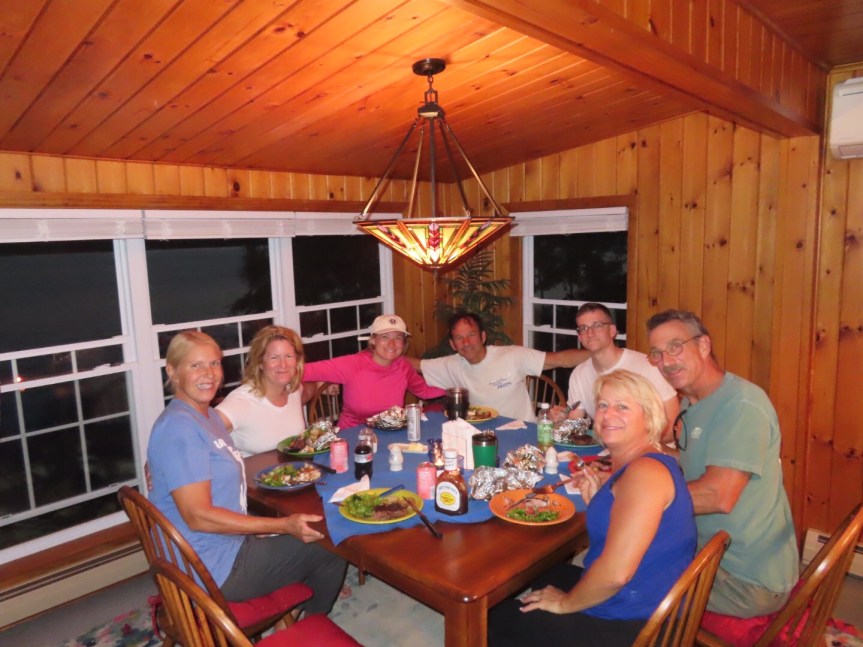 PJ and I prepped the potatoes and put together a nice salad. Lance fired up the barbecue and Jim took the helm on grilling up the steaks and fish. It all came together for a delicious feast and nice dinner as we all gathered around the table to eat. Their son Matt had arrived in the afternoon so it was nice for Laura to have the whole family together at the camp. After dinner, Jim lit up a campfire on the shore and everyone gathered outside to look at the stars and enjoy the warm summer evening at the lake. A thousand thanks again to Laura and Lance for putting us up, family time with the cousins and providing all the fun experiences for us greenhorns from the south.
