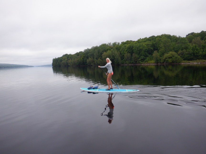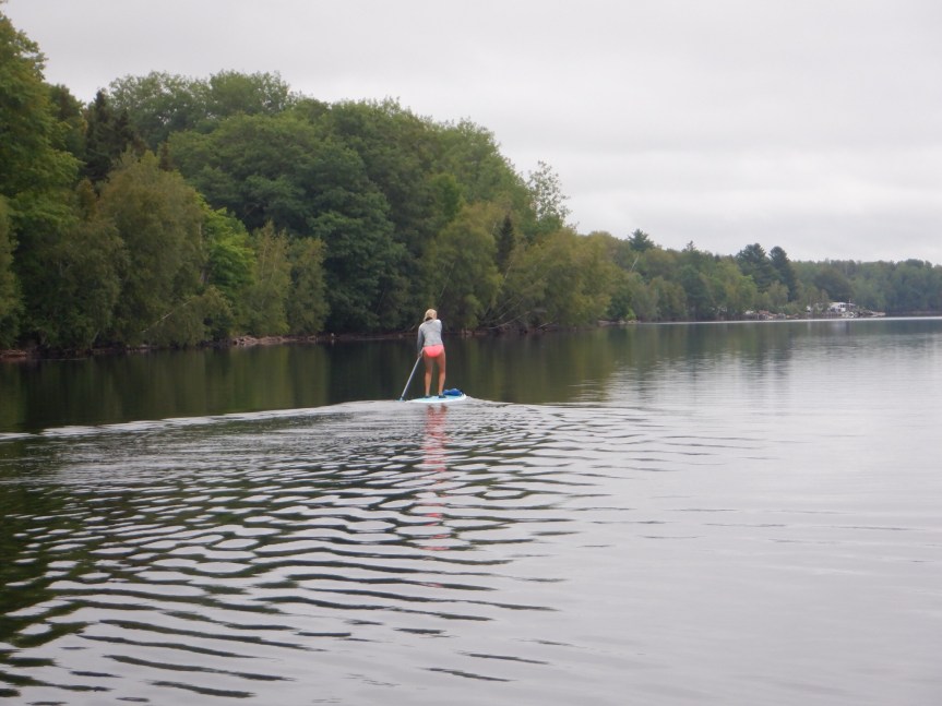 As I was nearing camp on the return paddle, out popped PJ from the launch area on her board. We decided to head west and see what there was to see going in that direction. More trees, less homes, a man sawing logs (not sleeping, just cutting timber), and a large eagle soaring overhead. We turned for home and PJ went into a power paddle sprint and left me in her wake. Paddling is always good for getting the blood pumping in the morning and the jump in for a swim is guaranteed to leave you wide awake.