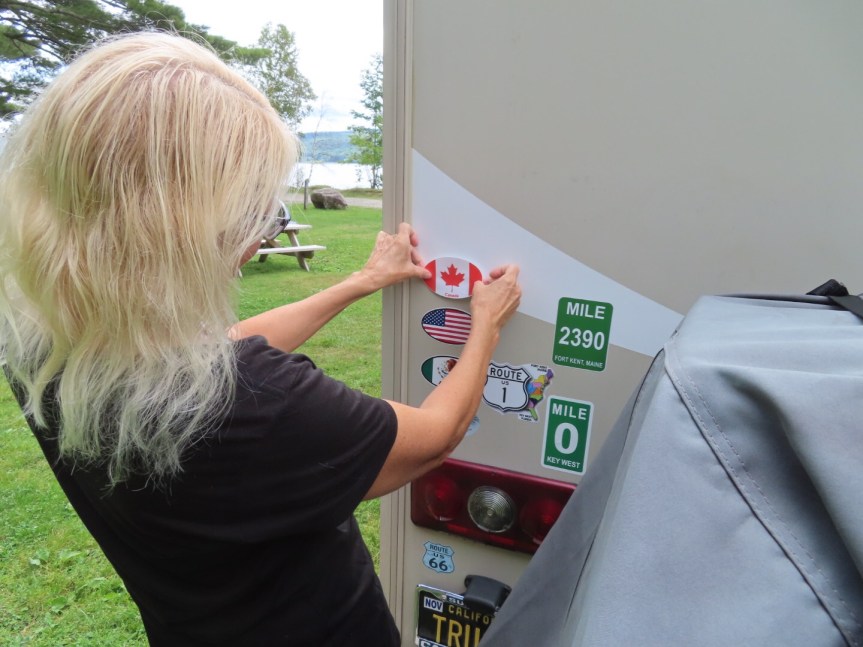 Valerie, the owner at Great Bear, told us to take our time breaking camp and leave when we wanted. We had coffee and sat for a while at the table doing internet stuff and figuring out our route. Our Verizon plan covers Canada but they didn’t tell us is that the data they offer here is 3G and painfully slow and weak. I couldn’t get any pictures to load on the blog so I finally gave up and thought I’d try again in a more populated area. We stuck on the Canada sticker and were ready to hit the road.