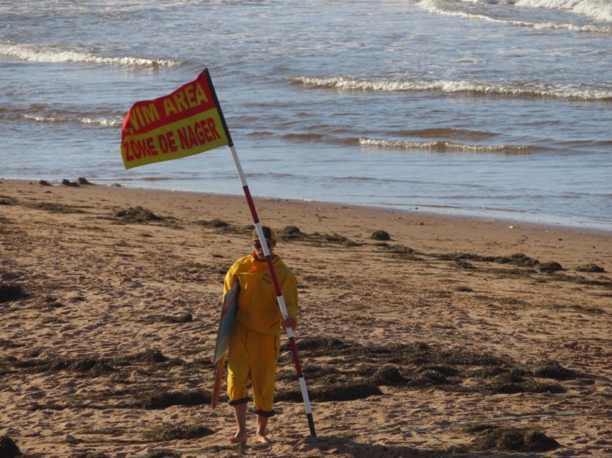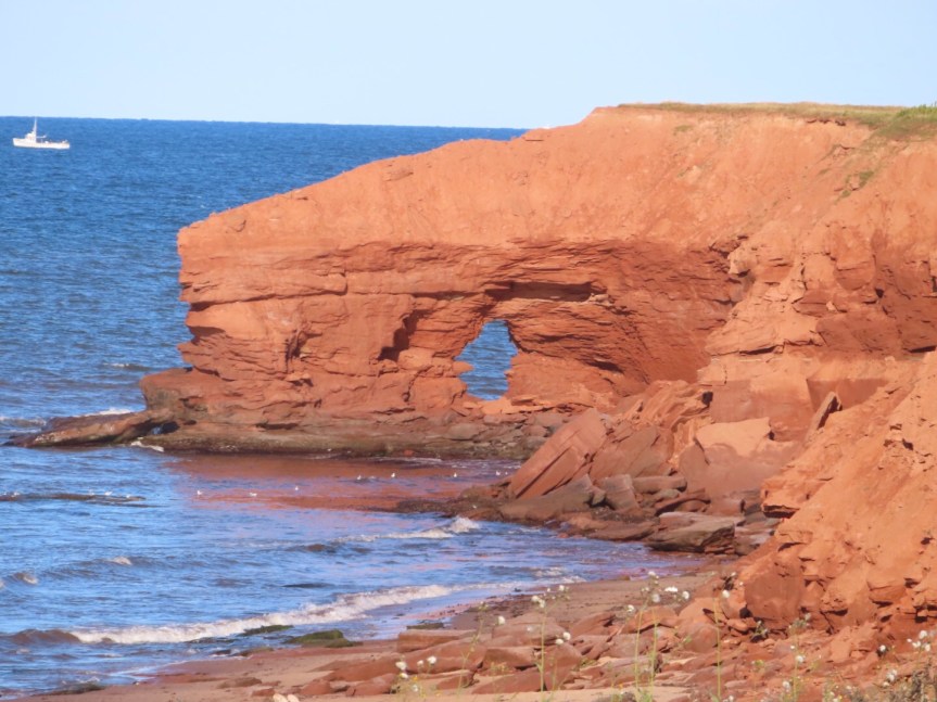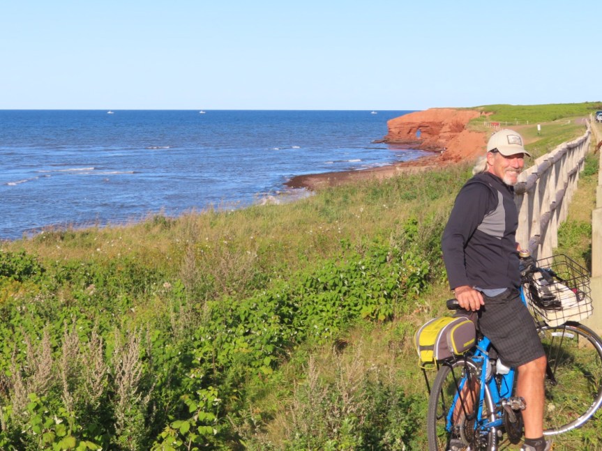 Prince Edward Island has tons of biking trails so we rallied in the afternoon and took the bikes for a hard ride down along the bluffs lining the Gulf. We were jamming into the wind all the way out to Cavendish Rustico. The path followed the water and the views were fantastic. This part of the world has some amazing scenery. Red cliffs down to the sea surrounded by fir trees and green fields. We crossed one pond on a floating bridge and skirted another on the way out of camp. Racing for home with wind at our backs had us flying down some fun hills and stopping by the popular beach with the long boardwalk.