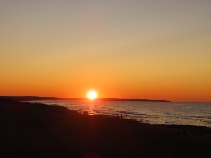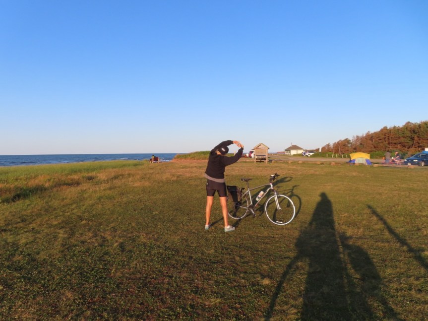 Back at the campground, a guitar player was setting himself up on the stage at the little amphitheater on the bluff. We rode home, packed sandwiches for dinner then pedaled back over and joined the crowd giving him a listen and watching the PEI sunset. An awesome end to a fun filled day.