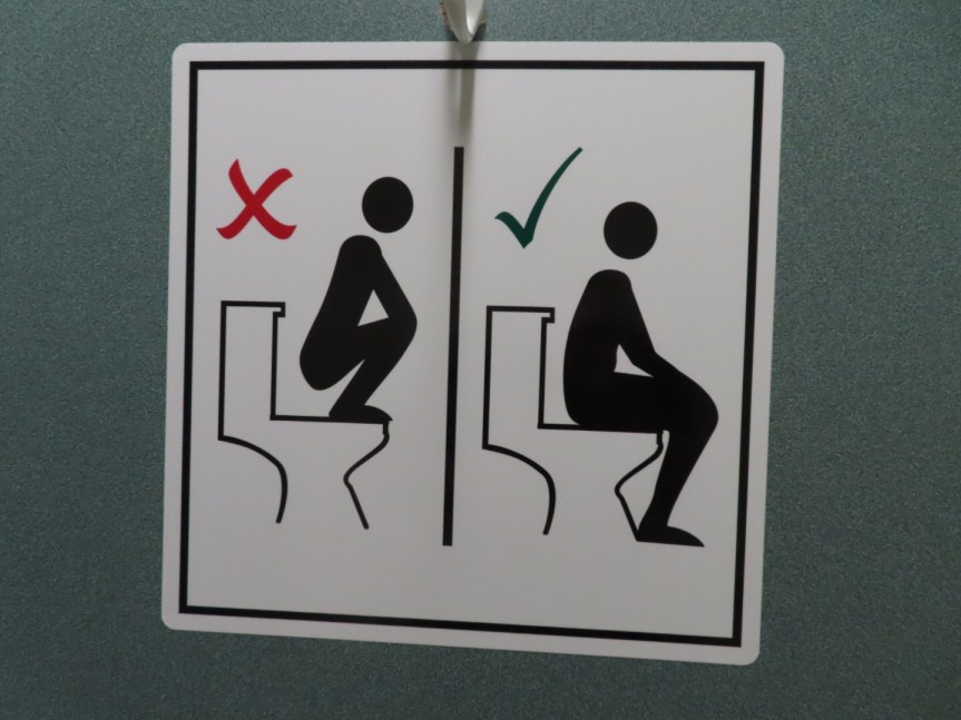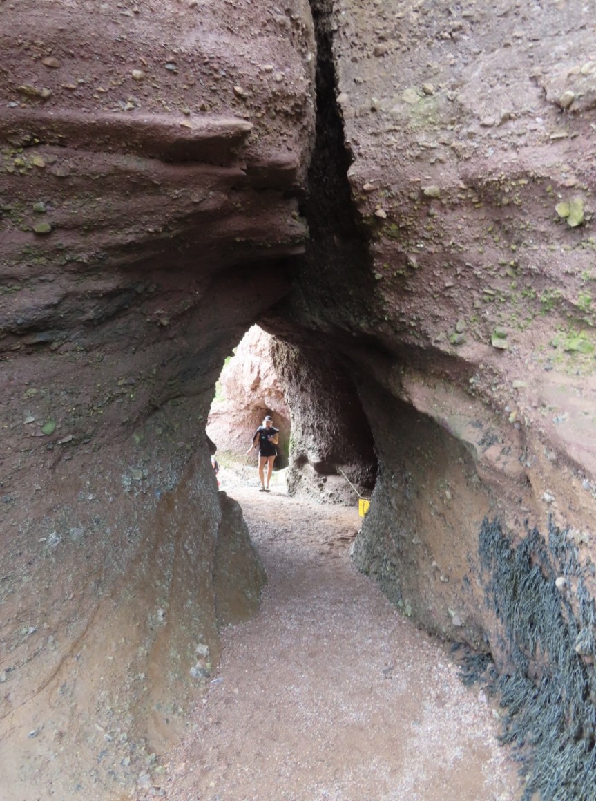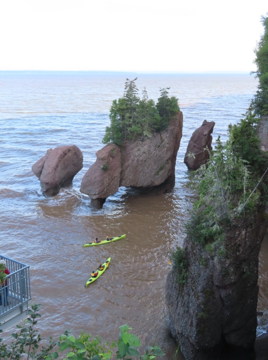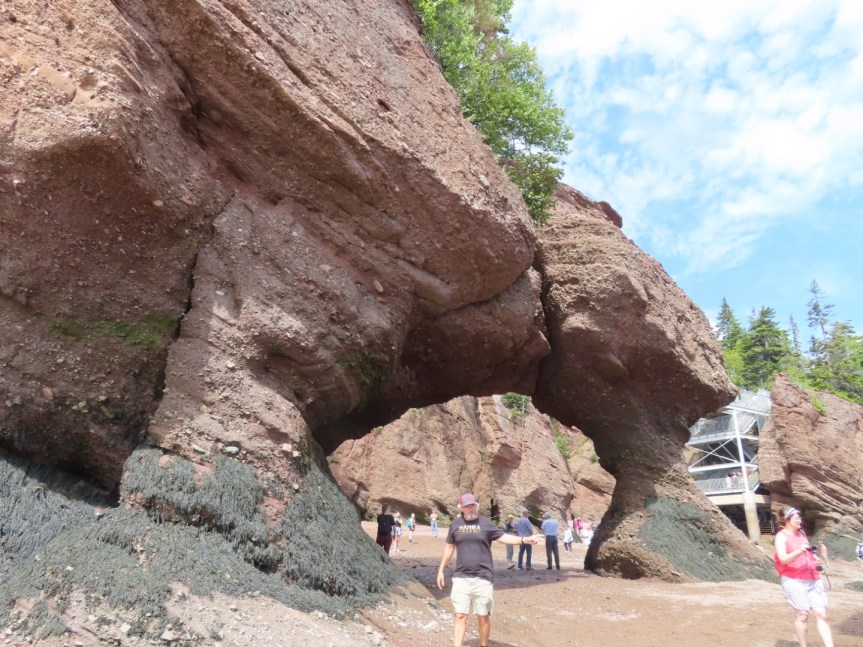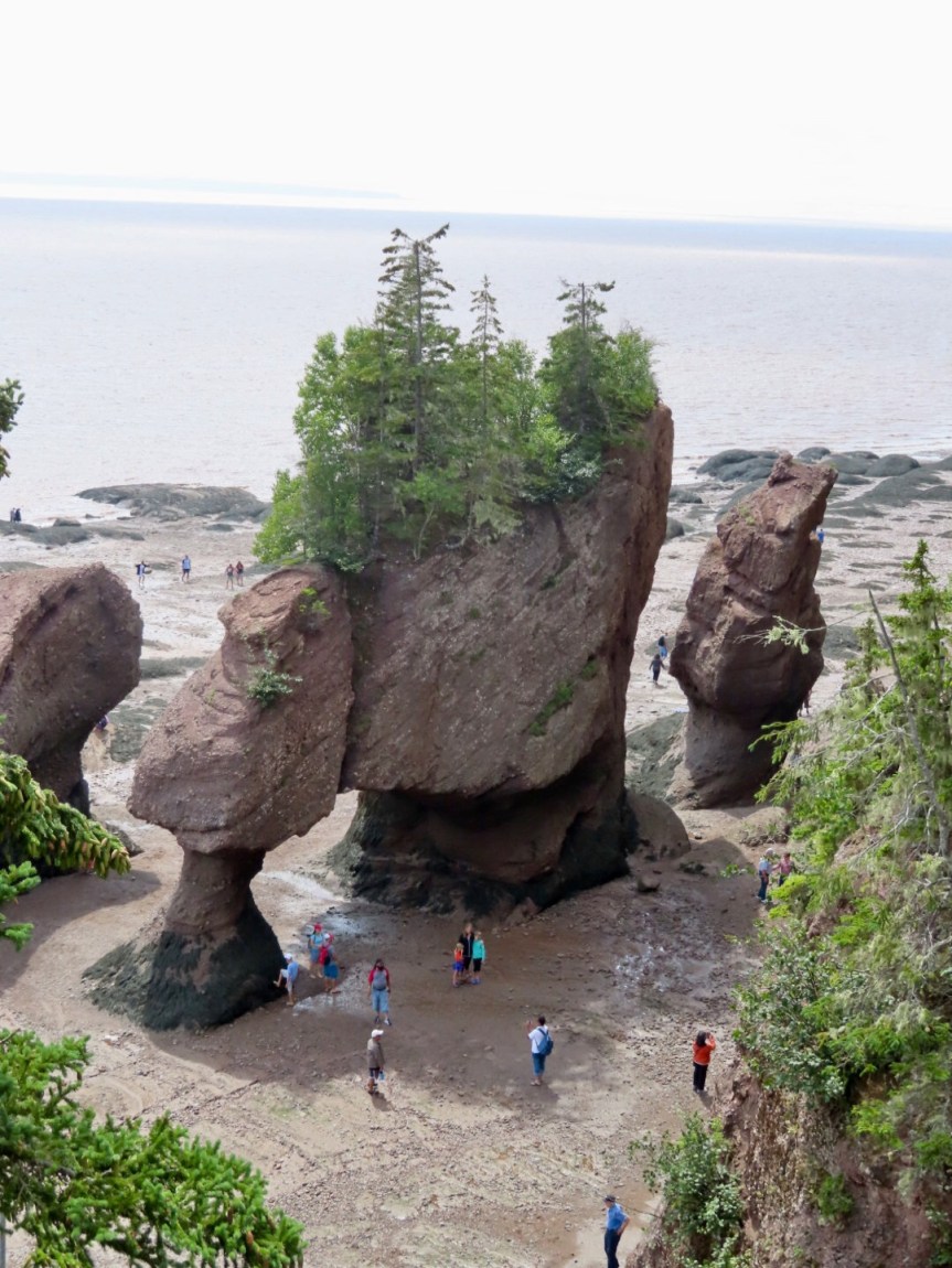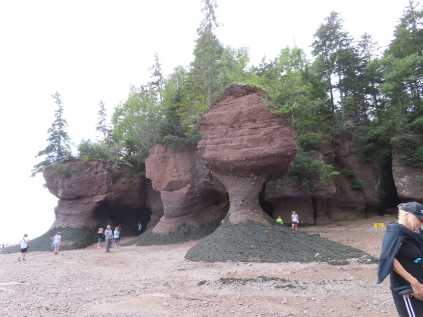 We arrived at Hopewell Rocks, paid our admission and joined 10,000 of our closest friends as we hiked the trail and made our way down the steps to meander around the seaweed and sand on the low tide beach. But not before stopping in the visitor center to use the loo where it seems some of Canada’s foreign visitors have a hard time keeping their feet on the floor.