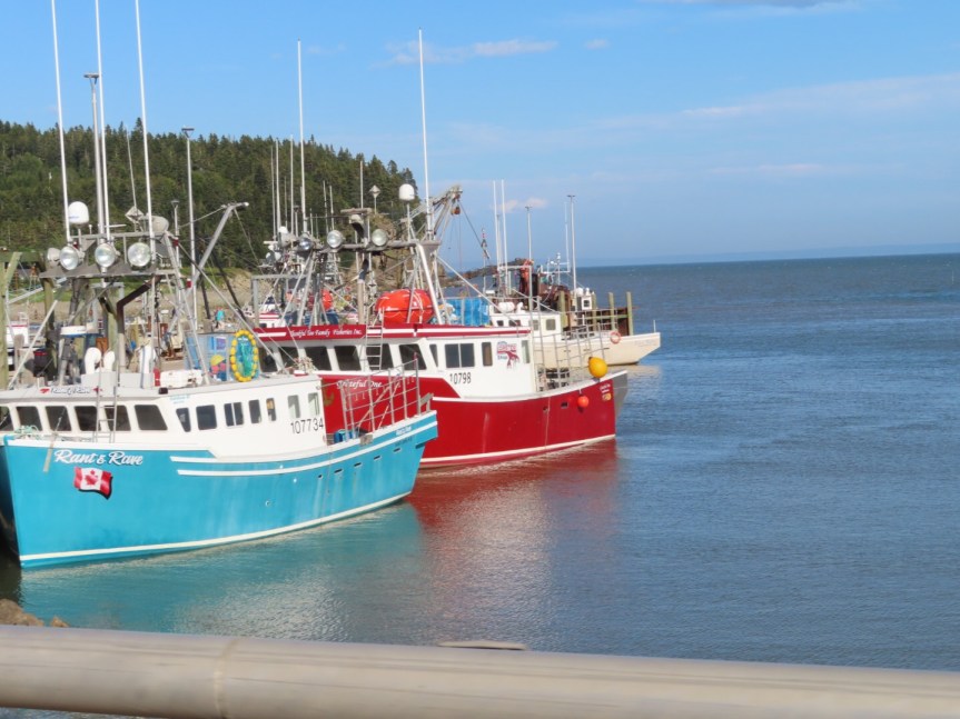 Our goal today was to check out the extreme tides that the Bay of Fundy is famous for. The bay has the largest changes in tide of anywhere in the world sometimes as much as 40 feet between high and low tide. Today’s difference is a mere 22 feet. Hopewell Rocks is a favorite spot for viewing the tides and a picturesque place to walk around on the ocean floor among the fascinating rock formations. Low tide was at 12:20 so we left the campground with enough time to make the 40 minute drive and get there to see it. The first thing we saw leaving camp was the view from our campground overlook where the boats at the dock below were now sitting on the bare ocean floor!