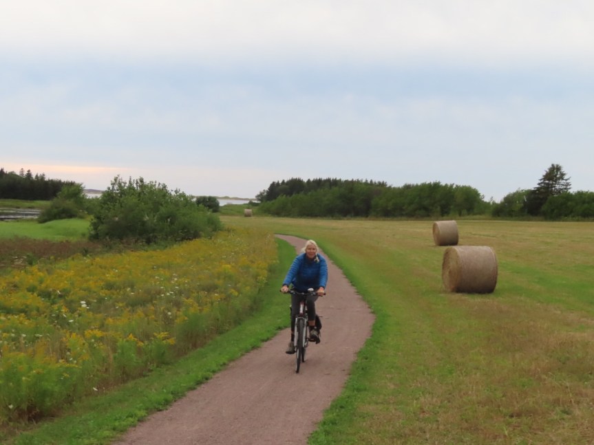 In the late afternoon, we decided to go bike a couple of the loops over to the west of the campground. Gravel and grass paths took us along estuaries and through a hay field before disappearing among the trees. We’d been out over an hour and the sun was starting to dim. We weren’t sure which way was out but we soon found a signpost and pedaled hard for home.