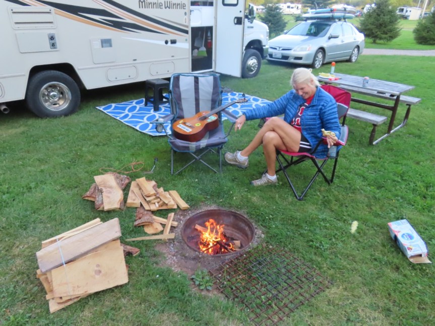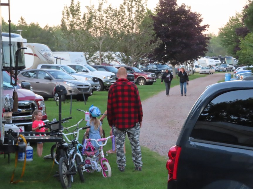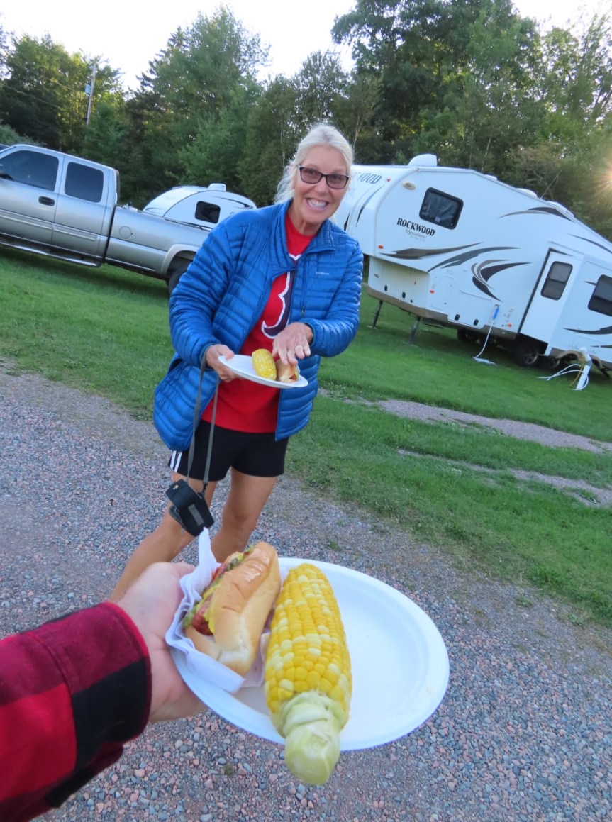 Not one to miss out on a free meal, I coerced PJ into going over to the hoe down. This area is pretty rural and the campers seem to all be locals from here in Nova Scotia. It has kind of like Missouri or Arkansas vibe. Guys in camo with ATVs, kids racing remote cars around the grass and loud country music wafting in from here and there. We joined the line picking up our plates of corn and dogs then said hello to Neil before walking back home to eat on the front porch. I confiscated PJs hot dog while she put together a veggie burger then we sat around our fire and relaxed into the evening practicing our social skills having conversations with some of the people strolling past our fire pit. We embraced the crowded one big family aura of the place and a fun Labor Day celebration.
