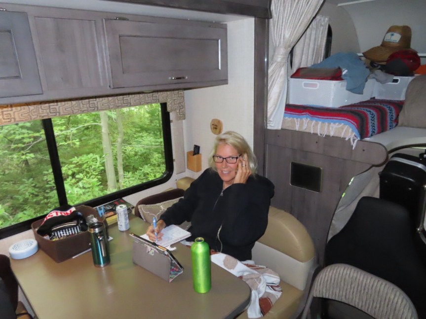 Not much going on today. PJ was on the phone for hours talking with friends back in California and doing step work with women from her home group. I pedaled the bike around the lower campground hunting for an internet hotspot that might actually function. The relay at the laundry building next to Ryan’s was slow as molasses but I did finally get a few pictures to insert into my post and get it done. We had planned to bike the 17 mile loop around the park but y the time we started suiting up the rain began to fall and we had to abort the mission.