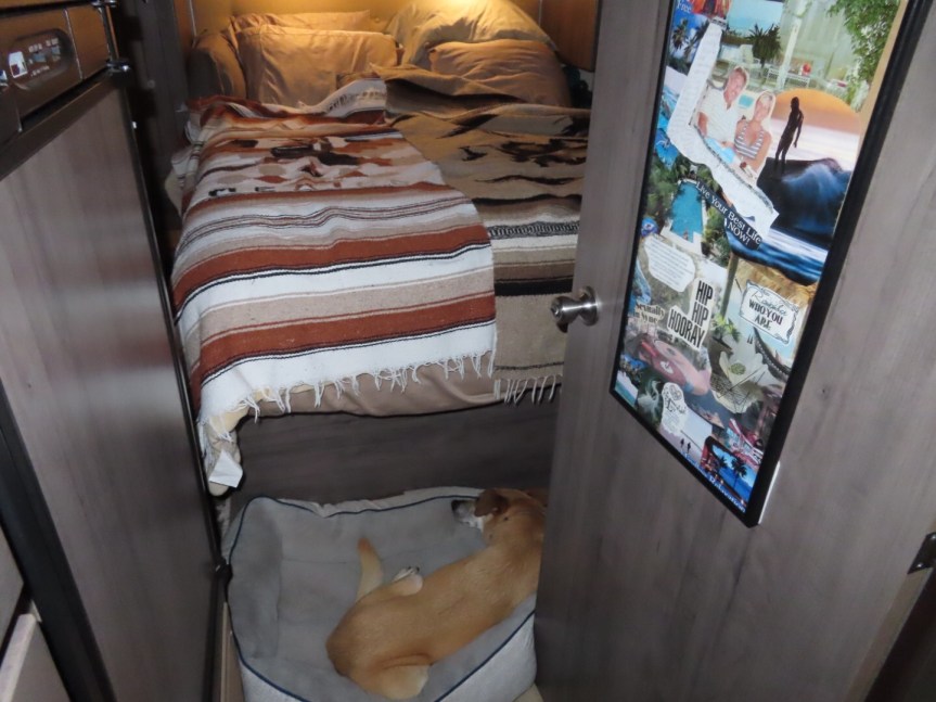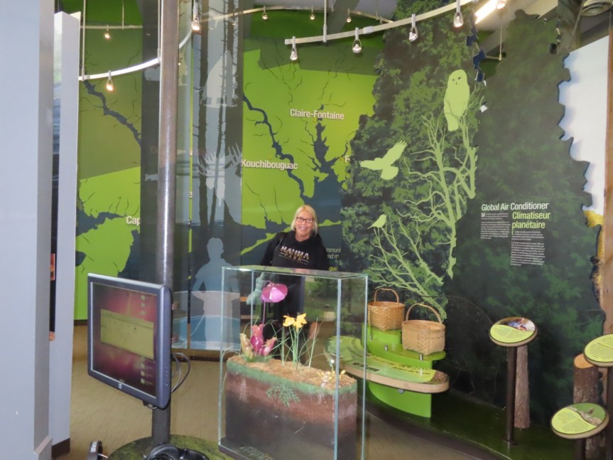 Instead, we drove into the visitors center at the entry to the park and spent some time checking out the exhibits and learning more about the park, the region and history of the people in this area of New Brunswick. Since the weather has been chilly of late, PJ shopped at the gift store for a coat to add to the wardrobe. She found a cute medium weight number to wear on trips into town while I picked out a Canadian National Park cozy to keep my beverages cold.