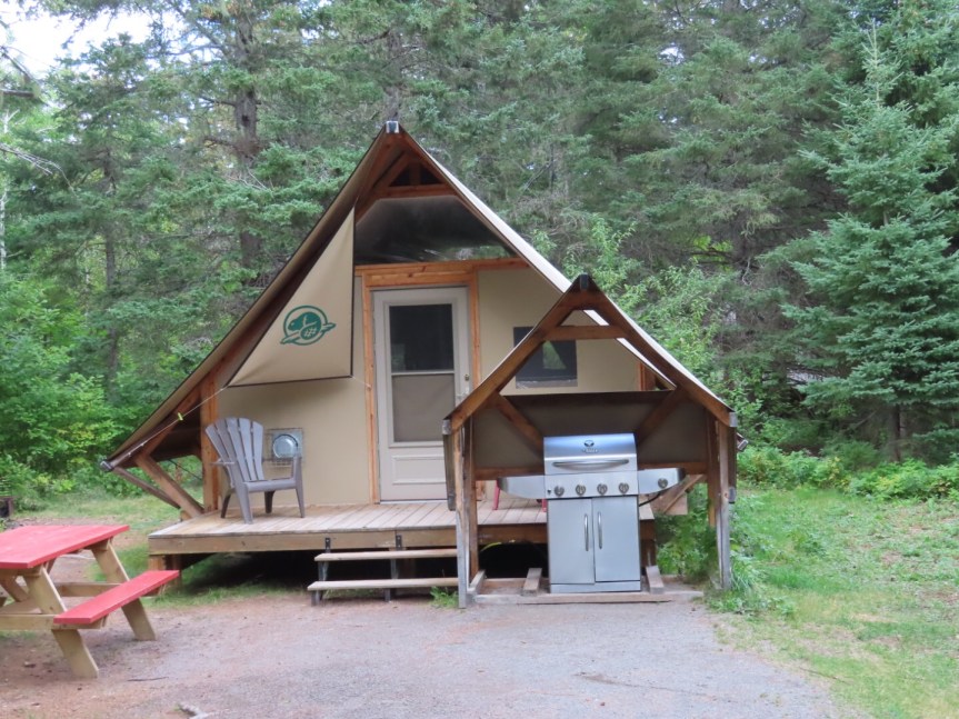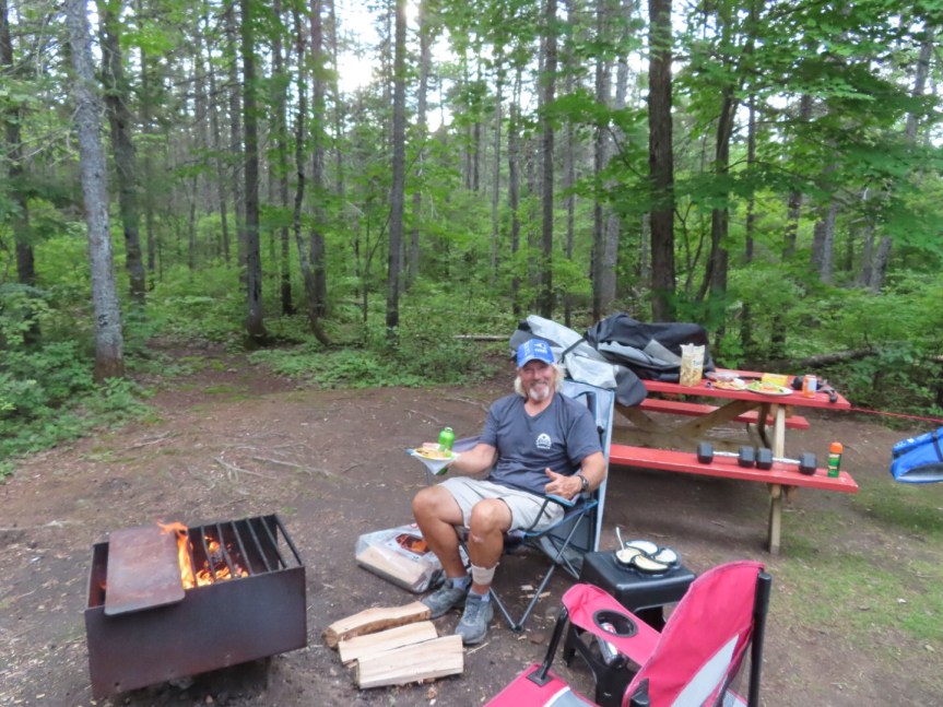 I lit a fire and we ate a dinner of vegetables, crackers, hummus, babagonoush and tzaziki in the quiet evening. There are a few other campers down a ways but it’s really peaceful tonight. We sat around the blaze, played guitar, talked and slapped mosquitoes. We packed everything away for tomorrow’s departure and covered anything else up in anticipation of tonight’s thunderstorms. We’ll see how we fare.