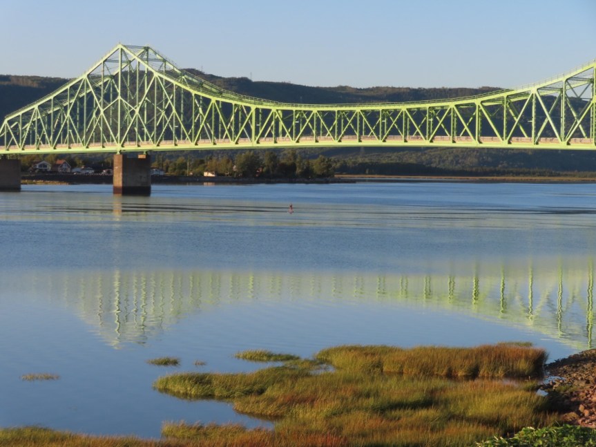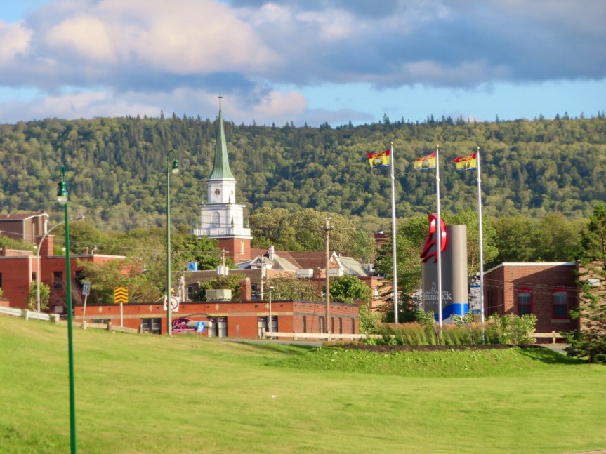We reluctantly left our cozy nook in the woods at Kouchibouguac and had a windy, swervy few hours driving down the road to Campbellton. It was a white knuckle road experience keeping me from watching the landscape passing by. I had forgotten to close the side compartment where I keep the plumbing goods and hoses. My pressure regulator for the hose had jumped out on the drive. Luckily, the gas station where I discovered it was right next door to an RV dealer, so I was able to replace it on the spot. What are the odds?