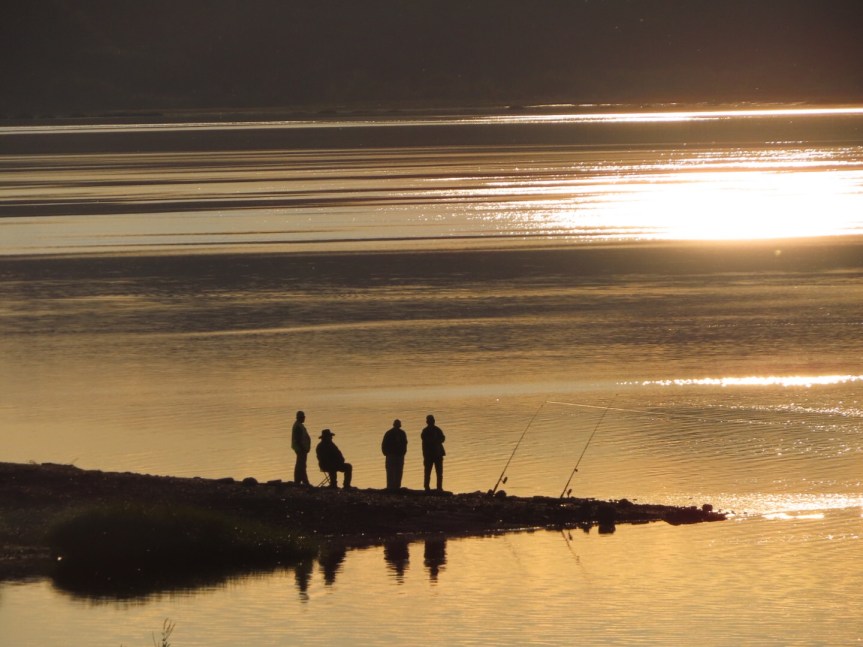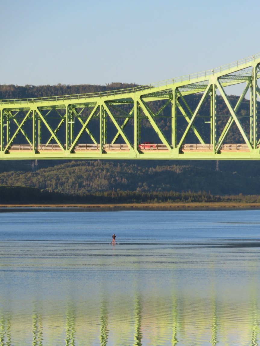 I paddled past the fisherman at the landing and headed out to the middle and under the picturesque green bridge that is the highlight of the area. I felt pretty small next to the big foundation blocks at the base. I went as far as the giant fish statue then paddled for home to beat the oncoming darkness. An awesome paddle. A swarm of skeeters was waiting for me at the beach. The fishermen joked with me a bit then I rejoined the family and we watched the sun fall behind the lush green hills to the west.