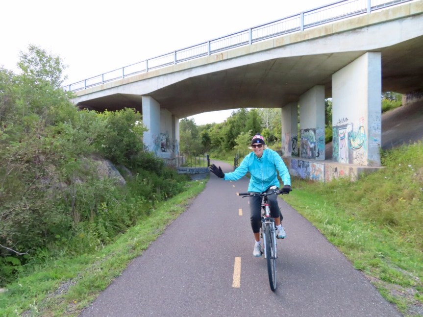 There is a wonderful series of bike trails that lead all around the town of Lévis. We had to cover a mile or two of country road to get to the bike path. The wind was blowing hard and the ride out was tough going. We pedaled through trees and meadows filled with wildflowers until finally reaching the Parc du Martiniere.
