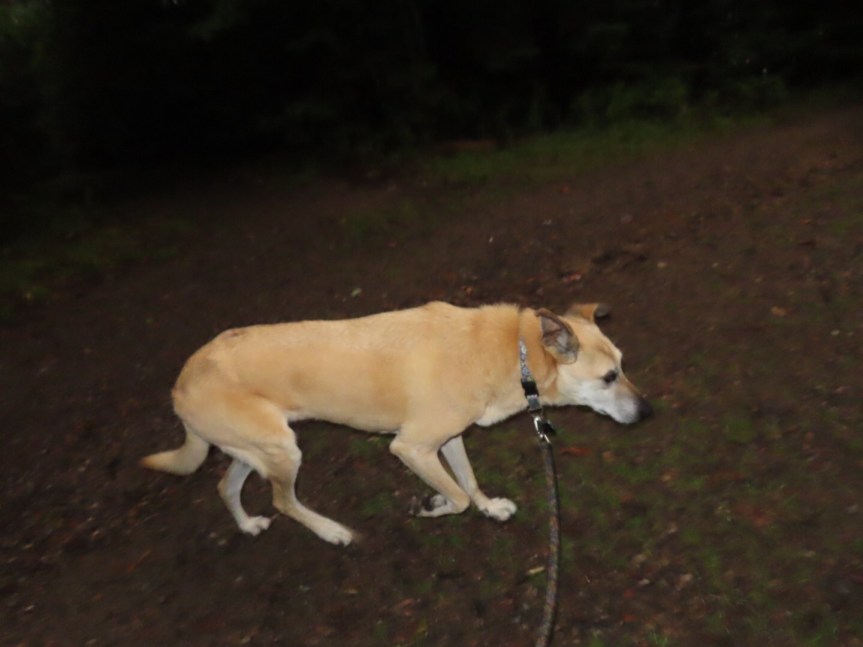 We pulled into Lac Chat campground in the pouring rain and at first we saw no other campers. Kind of spooky. But as we arrived at our reserved spot, there were a few other hardcore campers sitting out the rain. We got parked up and rested a while. When there was a break in the rain, I leashed up Cali and we went out to explore the campground. Half of the camp is no pets allowed and half is, kind of a weird set up. But Cali was a rebel and walked right past the no dog signs and we took a trail down to the lake to see what it looked like. Not as big as I thought but it had its own kind of pretty in a gunmetal gray evening glow.