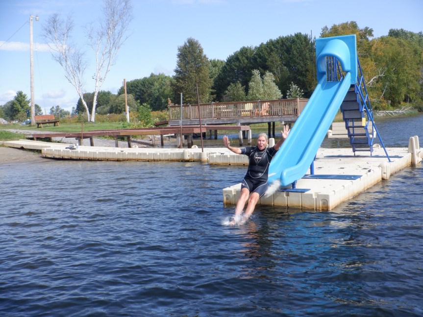 We reached our campground beach and the kid in PJ escaped her tether and had some fun on the slide. Each trip down provided a new jolt of coldness upon splashing into the river. We carried our gear up to our lawn area and took a short break out front. The only other camper in our row had vacated while we were out so we had plenty of elbow room.