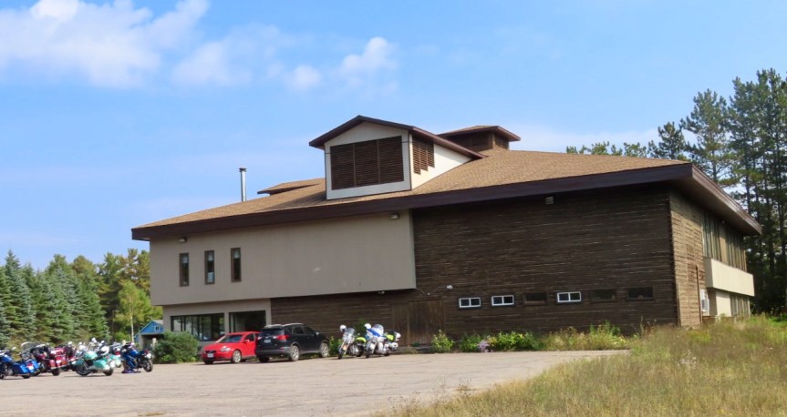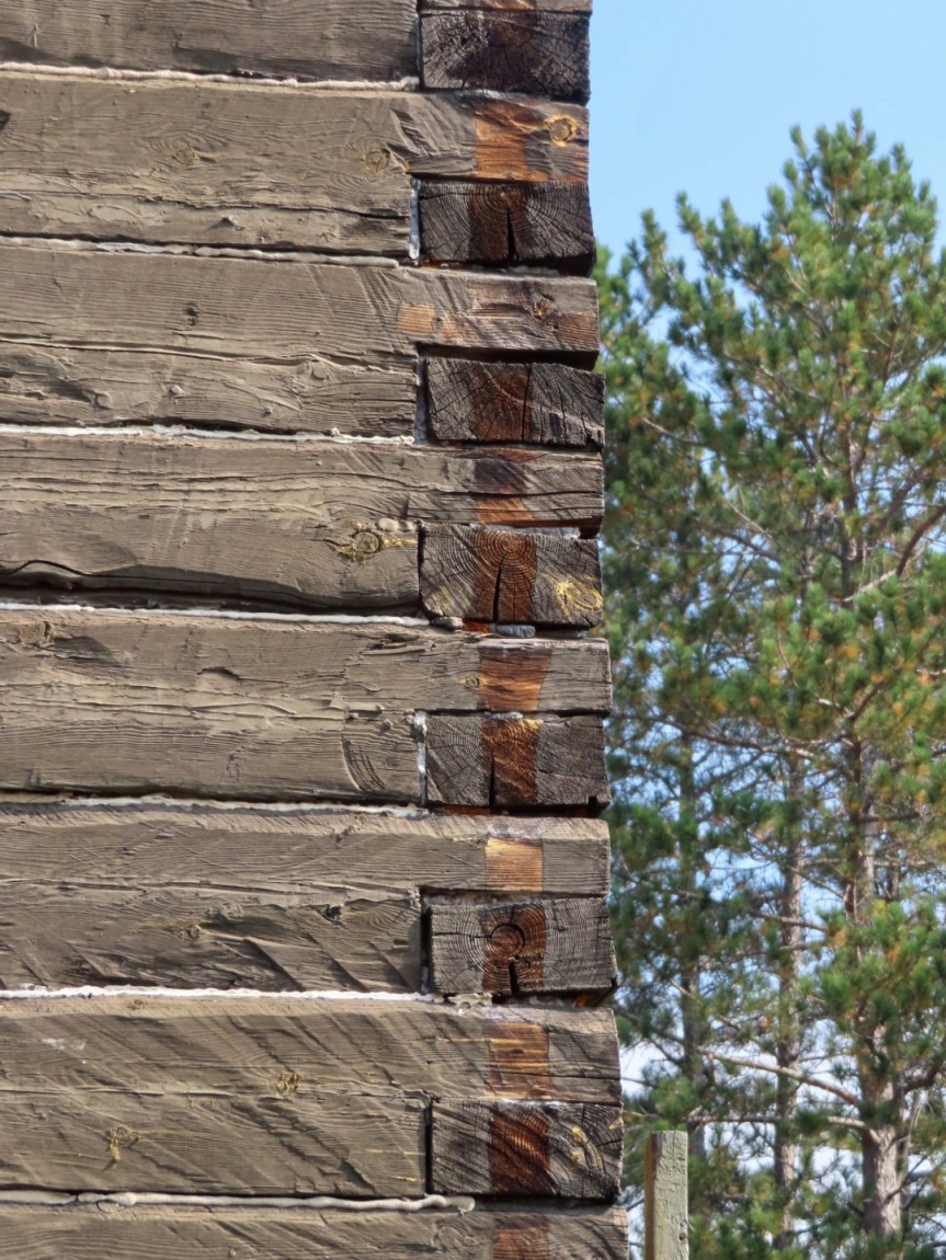 Thunderstorms were predicted for the afternoon, so I figured I’d better get out while the getting was good. At one o’clock, the sun was shining and it was turning into a pleasant day. I unhitched my bike and pedaled down towards the Hiawatha Conservation area where they have a series of mountain bike trails (more intel from my friend that I met up at Chippewa Falls yesterday). When I reached the church by Landslide Road, I stopped to have look. The walls are built from logs salvaged from an 1812 fort they had dismantled somewhere down the St. Mary’s River. I couldn’t find much more information but the construction was interesting to see.