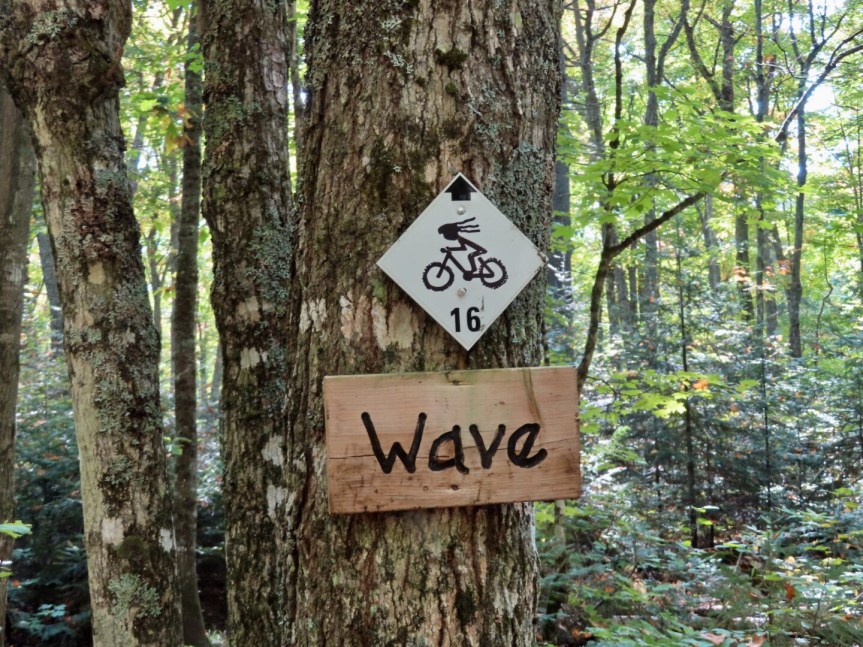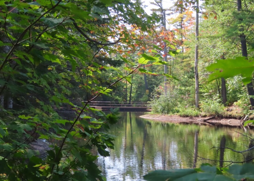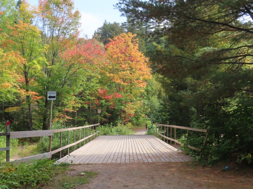I hit a trail that led down some steep grades to a small pond at the bottom. Of course, what goes down must go back up and I was faced with some crazy steep, sandy climbs on the other side. A few times, the old heavy hybrid wasn’t up to the task and I had to get off and push it up the grade. Or maybe it is the motor that wasn’t up to the task. On the other side I was enveloped by trees intent on showering me with falling leaves as I pedaled through the forest.