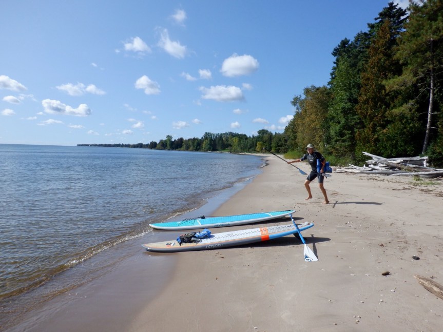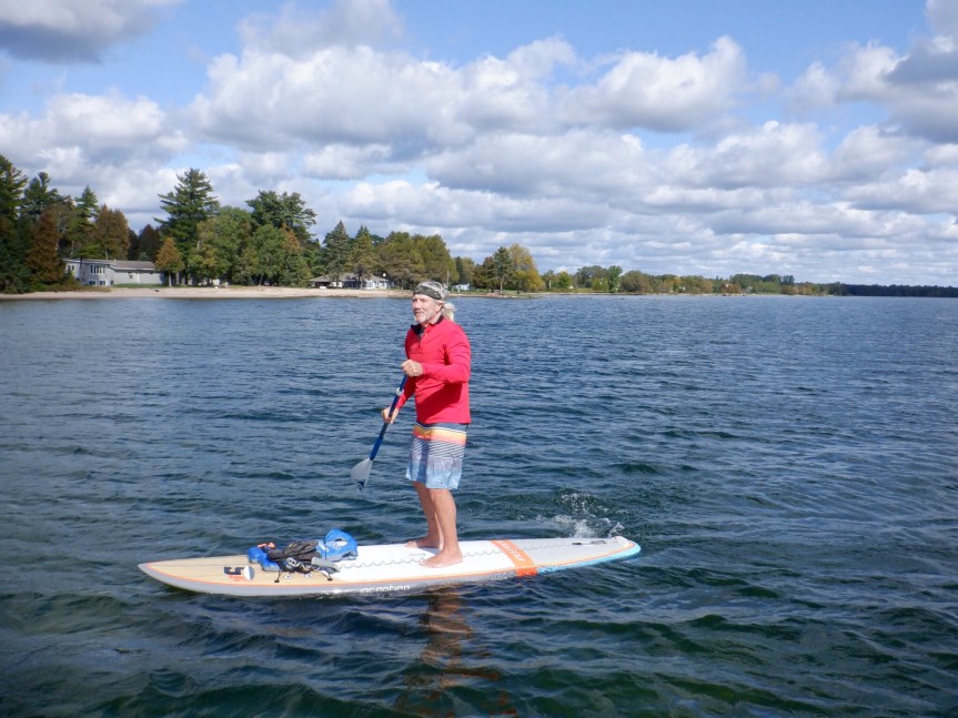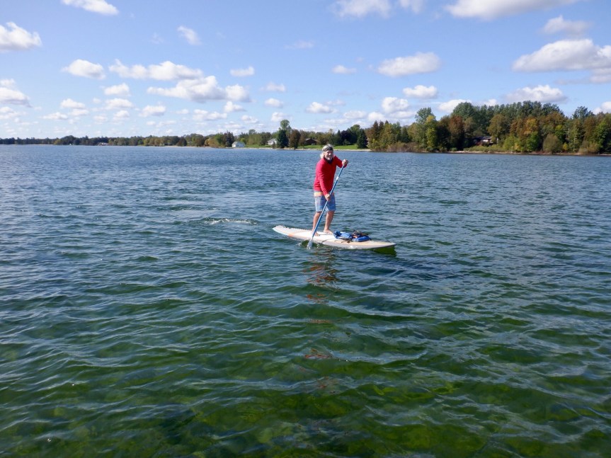 We had some oatmeal and waited for the temperature to rise a bit before launching the SUPs and paddling south into the wind. We cruised for a little over an hour past vacation homes and patches of forest. Our objective was to reach the far point of land that we could see from our camp to see what lay beyond. When we reached the outcrop and turned the corner there was just another point beckoning us to go about the same distance to reach it. We had to decline the invitation to explore and turn around and head for home.