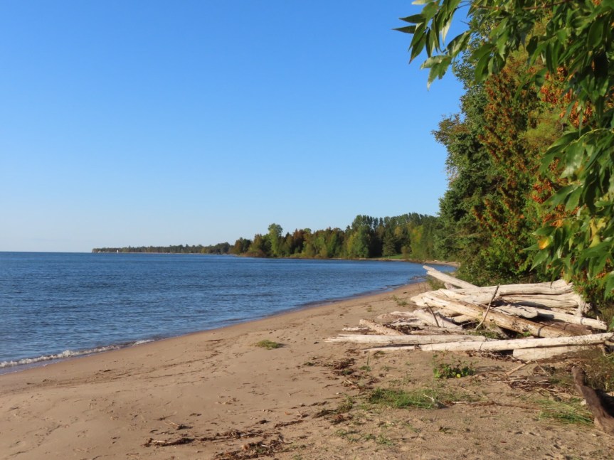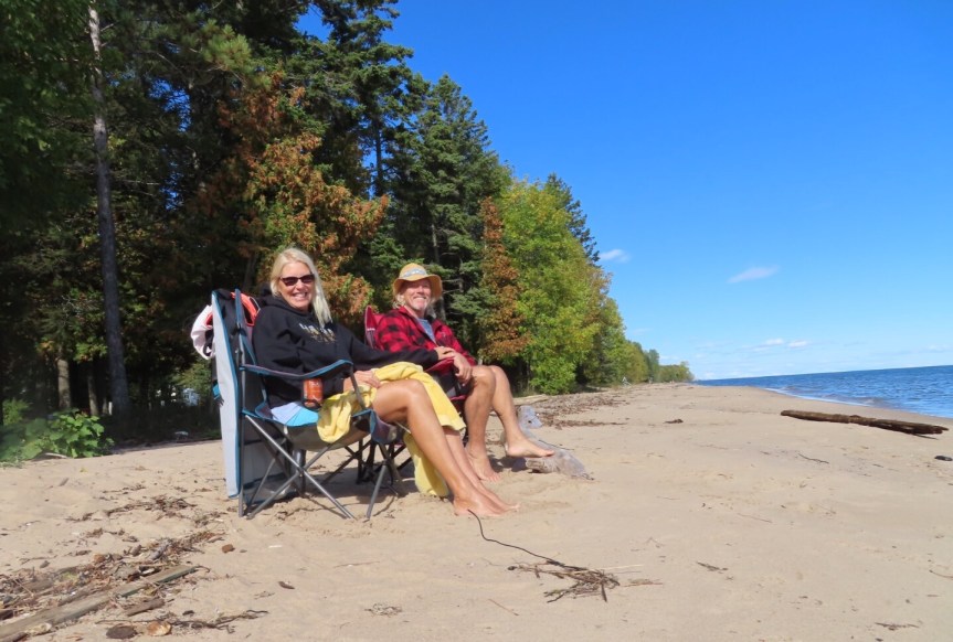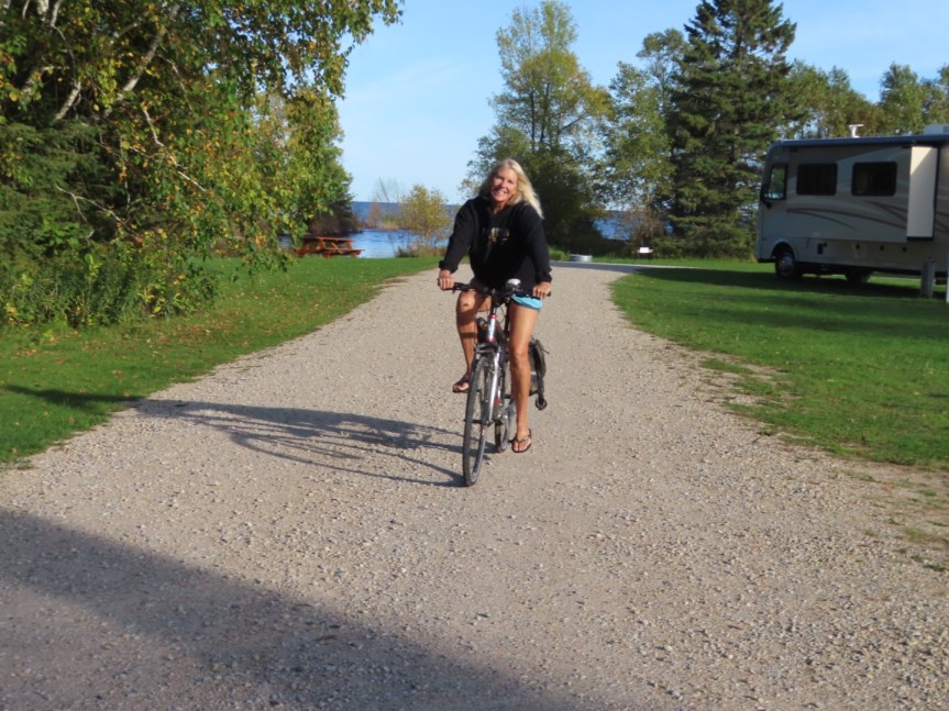 Later in the day, we took our bikes to check out the neighborhood. We cruised the campground then followed Bark River from the boat ramp at the rivermouth by the overflow camp spots then up to the road where it passes under the bridge at the highway. It might be interesting to paddle but it narrows at the bridge and the current moves really fast coming underneath. I don’t think we’d make it much further than just before the overpass then we’d be forced to turn around.
