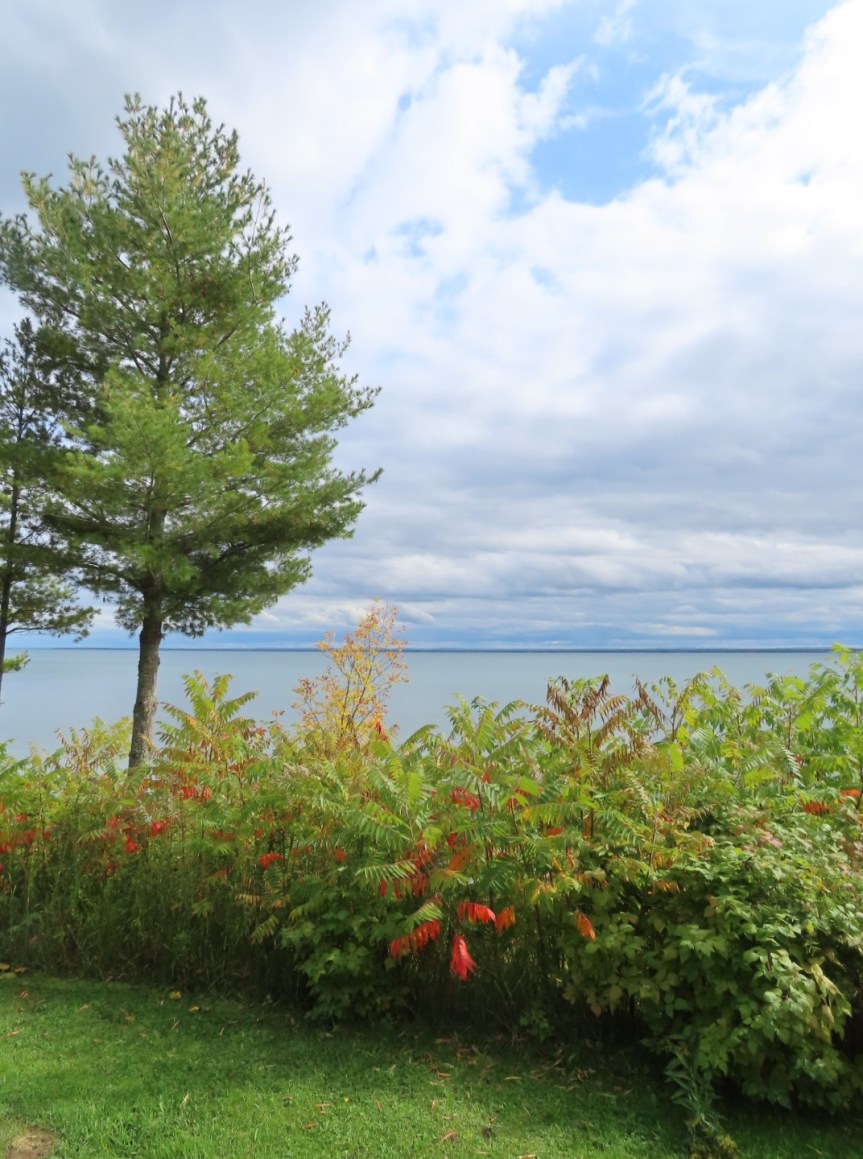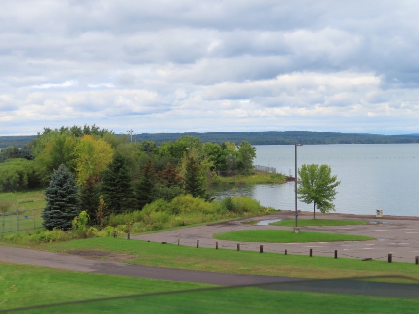 It was only a few miles further to Memorial Campground. It’s a first come, first serve affair, but there were plenty of spots. We put our cash into an envelope for site #6 and moved on in. We are on a little bluff overlooking the lake. The weather has calmed quite nicely and the sun almost made its way through the clouds. PJ had an online issue she was trying to get straightened out on her iPad then we took a nap to try to shake off this headache that has ridden along with me for the entire drive.