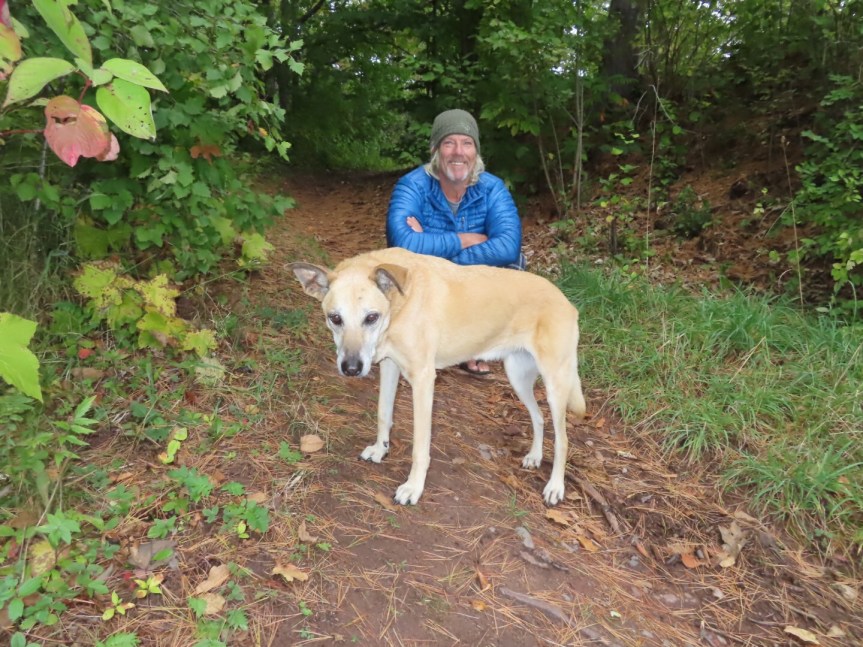 Mike, the owner, was hesitant about getting out of his chair to do the pumping and I almost thought he was going to send me down the road. But, in the end, he filled us up and just in time since tonight is going to be down into the high thirties or low forties. We took Cali down a trail behind his shop to walk along the shores of Lake Superior. We are now back on the far western edge of the lake. Beautiful even with the inclement weather, the lake was a monotone gray.