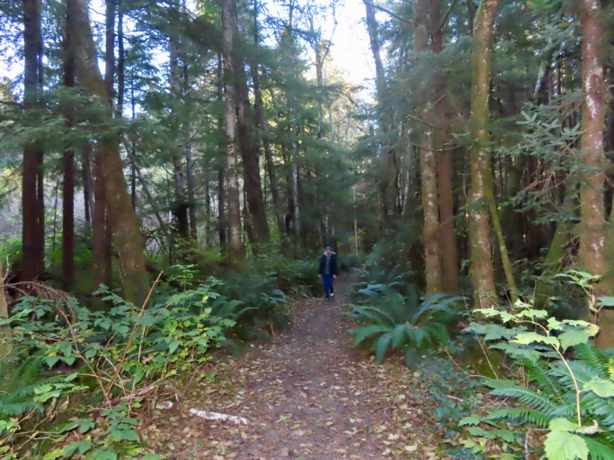 After a glorious afternoon nap, we set our sights on hiking out to third beach at the far end of La Push. We set a fast pace going up the hill along the asphalt sidewalk. We reached the trailhead for Second Beach where a few cars were parked and continued on past the fire station to where the sidewalk ended and we had to hug the side of the narrow road dodging traffic until we reached the pull out for Third Beach about three miles from our start. From there it was a mile and a half of forest trail out to the beach.