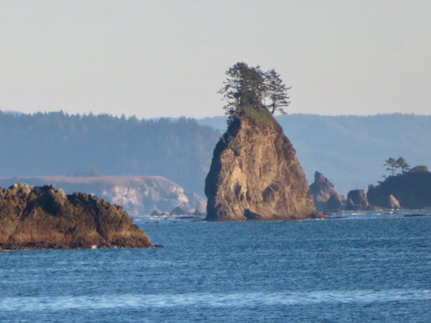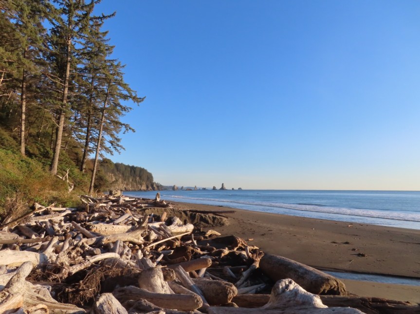 Another amazing, isolated Pacific Northwest beach with nobody on it but us. A large rocky headland guarded the cove to the north and a ring of rock islands rounded out the horseshoe to the south. The requisite pile of driftwood trees greeted us at the mouth of the stream where the trail reached the beach. We beach combed for a short while but we had napped too long and the sunset was going to catch us out on the trail if we tarried longer.