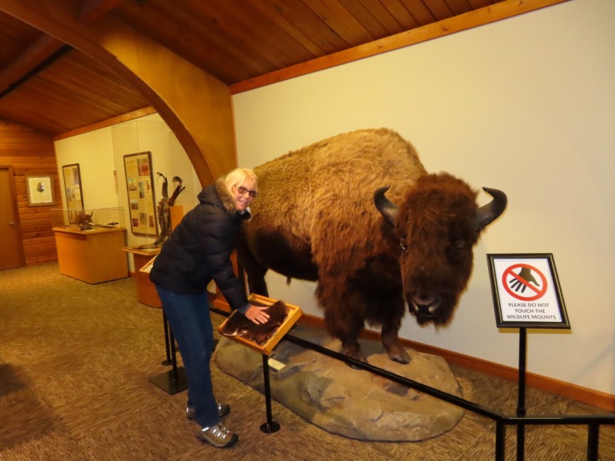 We walked over to the Buffalo Museum and watched a short video on the history of the bison in the old west. From massive herds, to massive slaughter, to near extinction they covered the recent successes in bringing them back to parts of the west. We wandered the exhibits and learned about the natural history of the prairie states. After exiting through the gift shop, we headed out to hunt down some of the buffalo that they have on the grounds.