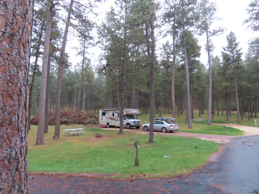 An hour or so later we were dragging our burnt out carcasses across the closed entrance to Custer State Park. We stuffed our entry fees into a self serve envelope and drove the rest of the way to our campsite at the Blue Bell Campground. It was maybe a quarter full. We found our spot and got set up and gratefully stopped driving for the day. Over nine hours on the drive including all of our breaks and dog walks. The time changed again entering South Dakota so it was earlier by the clock’s reckoning but we were in bed for an early night.
