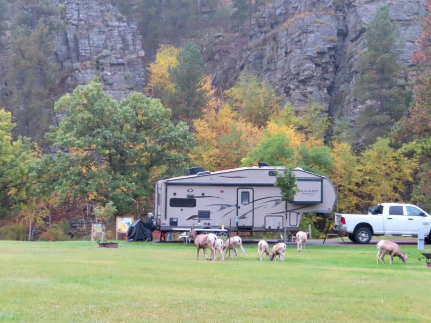 We stuck with the herd for a while watching the different interactions and enjoying the spectacle of so many beasts moving along as a group. We headed back to the RV hoping for a break in the weather before heading over to Mount Rushmore. A large family of mountain sheep were cruising the campground unimpressed by the collection of humans that were parked up in their habitat. We rested until two o’clock then drove over to Keystone to check out the carvings on the side of Mount Rushmore.