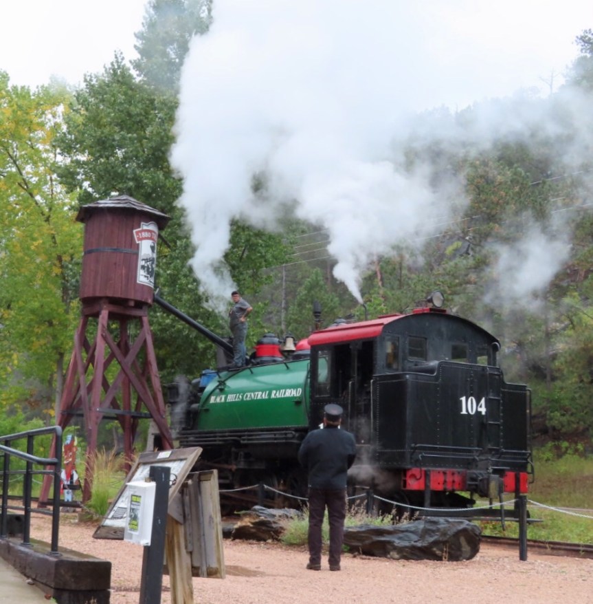 We passed through Custer as the tourist train was loading up its passengers. The main street was lined with restaurants and tourist traps, many of which were already shuttered up for the winter. A short ways up the road we came to the entry for Mount Rushmore and paid our parking fee. The girl at the gate assured us that our fare was good for multiple entries in case the fog and mist obscured the view too much.
